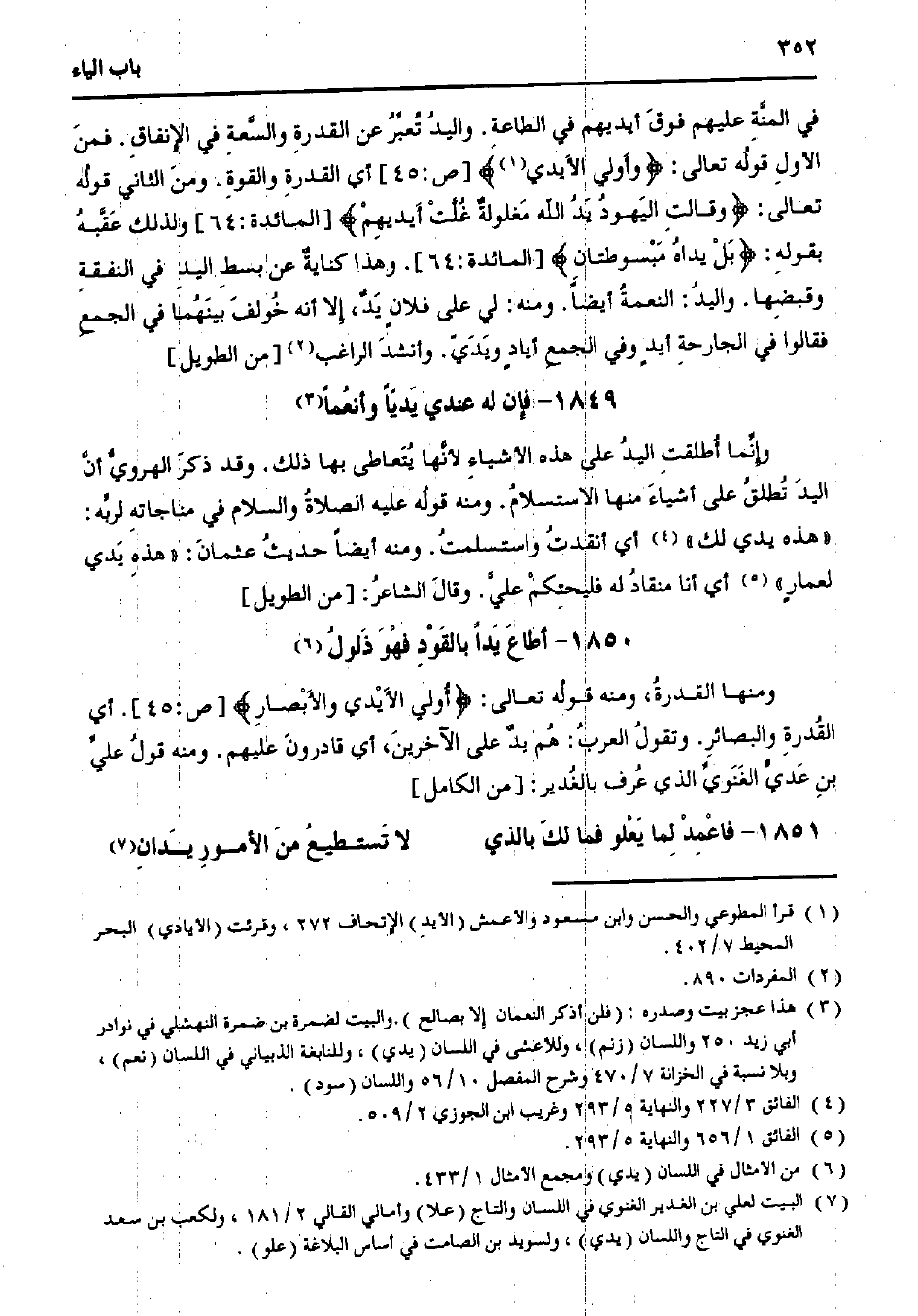 وإنما أطلقت اليد على هذه الأشياء لأنها يتعاطى بها ذلك. وقد ذكر الهروي أن اليد تطلق على أشياء منها الاستسلام. ومنه قوله عليه الصلاة والسلام في مناجاته لربه: «هذه يدي لك» أي أنقدت واستسلمت. ومنه أيضًا حديث عثمان: «هذه يدي لعمارٍ» أي أنا منقاد له فليحتكم علي. وقال الشاعر: [من الطويل]