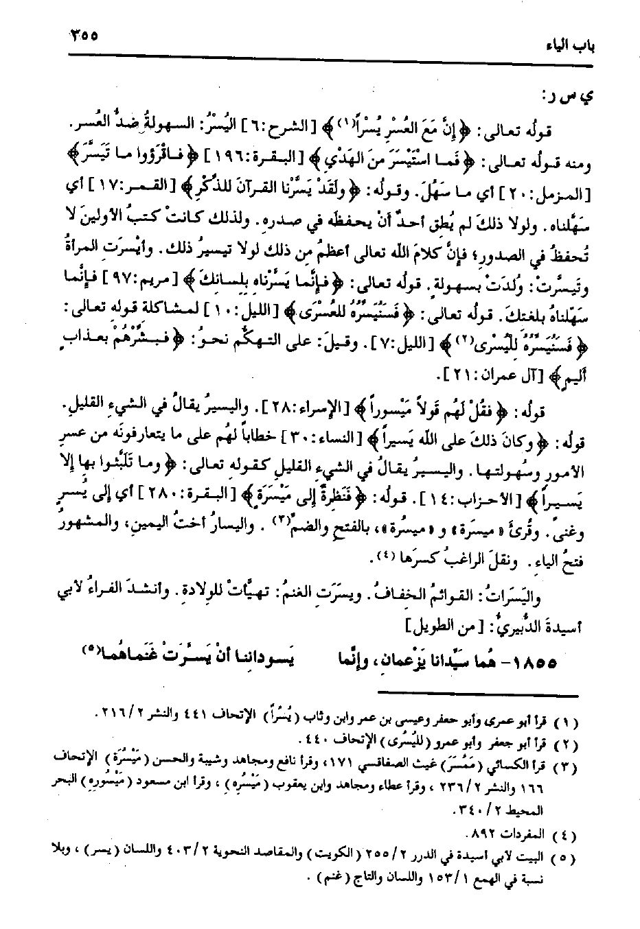 قوله تعالى: {إن مع العسر يسرًا} [الشرح: 6] اليسر: السهولة ضد العسر. ومنه قوله تعالى: {فما استيسر من الهدى} [البقرة: 196] {فاقرؤوا ما تيسر} [المزمل: 20] أي ما سهل. وقوله: {ولقد يسرنا القرآن للذكر} [القمر: 17] أي سهلناه. ولولا ذلك لم يطق أحد أن يحفظه في صدره. ولذلك كانت كتب الأولين لا تحفظ في الصدور؛ فإن كلام الله تعالى أعظم من ذلك لولا تيسير ذلك. وأيسرت المرأة وتيسرت: ولدت بسهولةٍ. قوله تعالى: {فإنما يسرناه بلسانك} [مريم: 97] فإنما سهلناه بلغتك. قوله تعالى: {فنيسره للعسرى} [اللليل: 10] لمشاكلة قوله تعالى: {فنيسره لليسرى} [الليل: 7]. وقيل: على التهكم نحو: {فبشرهم بعذابٍ أليمٍ} [آل عمران: 21].