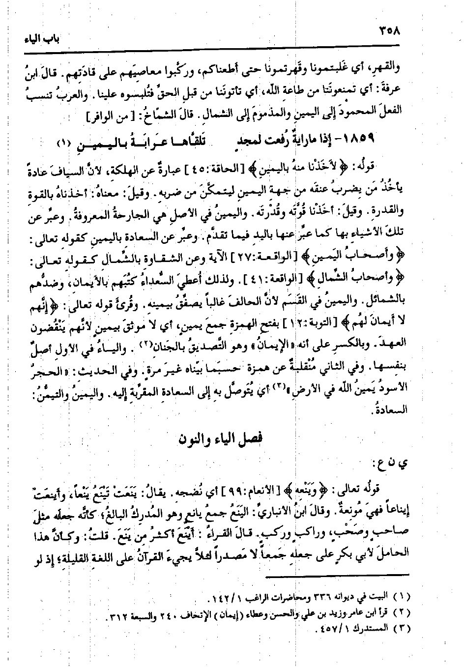 قوله: {لأخذنا منه باليمين} [الحاقة:45] عبارة عن الهلكة، لأن السياف عادةً يأخذ من يضرب عنقه من جهة اليمين ليتمكن من ضربه. وقيل: معناه: أخذناه بالقوة والقدرة. وقيل: أخذنا قوته وقدرته. واليمين في الأصل هي الجارحة المعروفة. وعبر عن تلك الأشياء بها كما عبر عنها باليد فيما تقدم. وعبر عن السعادة باليمين كقوله تعالى: {وأصحاب اليمين} [الواقعة:27] الآية وعن الشقاوة بالشمال كقوله تعالى: {وأصحاب الشمال} [الواقعة:41]. ولذلك أعطي السعداء كتبهم بالأيمان، وضدهم بالشمائل. واليمين في القسم لأن الحالف غالبًا يصفق بيمينه. وقرئ قوله تعالى: {إنهم لا أيمان لهم} [التوبة: 12] بفتح الهمزة جمع يمينٍ، أي لا موثق بيمينٍ لأنهم ينقضون العهد. وبالكسر على أنه «الإيمان» وهو التصديق بالجنان. والياء في الأول أصل بنفسها. وفي الثاني منقلبة عن همزة حسبما بيناه غير مرةٍ. وفي الحديث: «الحجر الأسود يمين الله في الأرض» أي يتوصل به إلى السعادة المقربة إليه. واليمين والتيمن: السعادة.