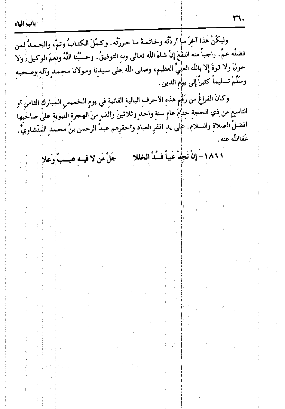 وكان الفراغ من رقم هذه الأحرف البالية الفانية في يوم الخميس المبارك الثامن أو التاسع من ذي الحجة ختام عام سنة واحدٍ وثلاثين وألفٍ من الهجرة النبوية على صاحبها أفضل الصلاة والسلام. على يد أفقر العباد وأحقرهم عبد الرحمن بن محمد المنشاوي. عفا الله عنه.