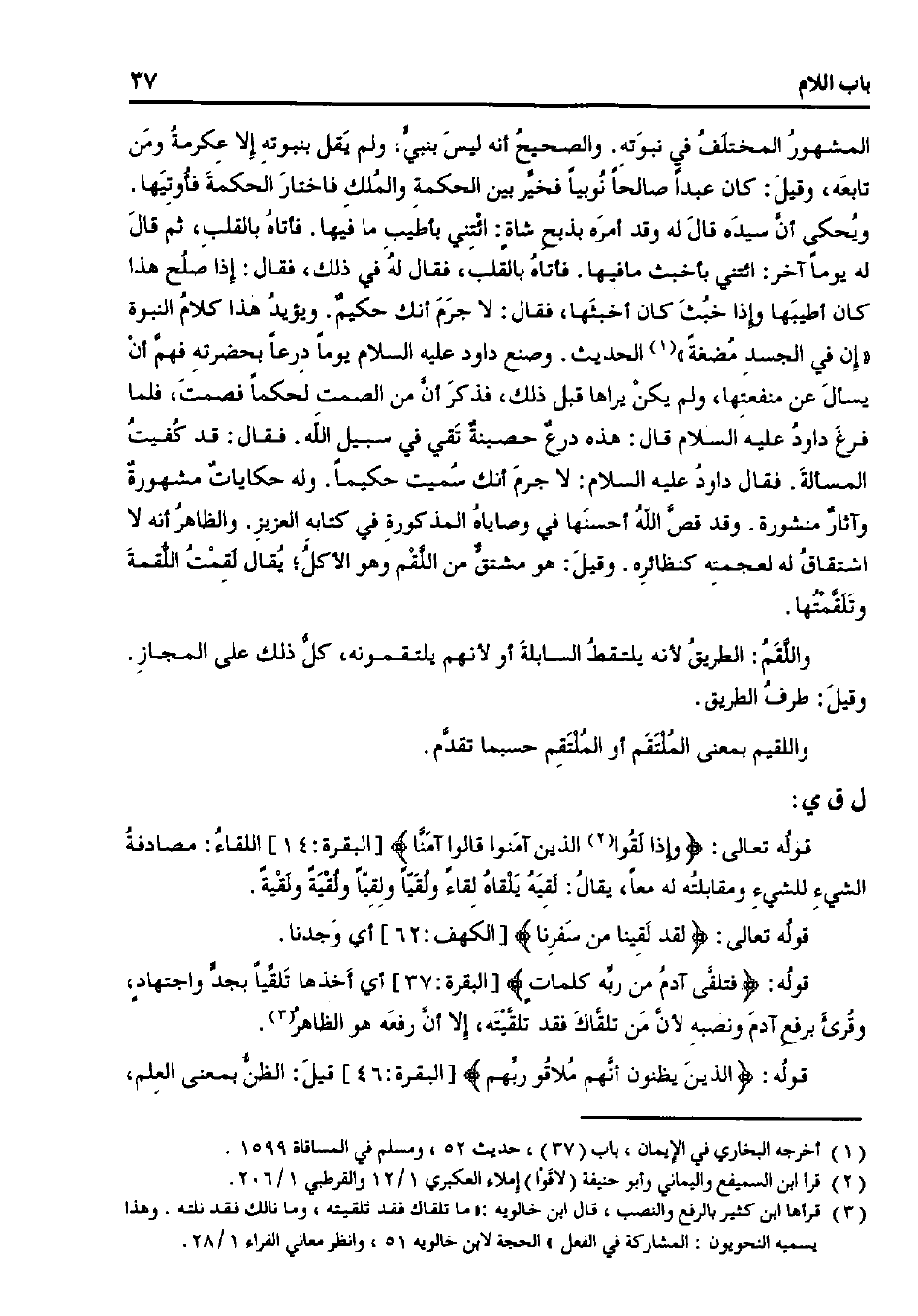 المشهور المختلف في نبوته. والصحيح أنه ليس بنبي، ولم يقل بنبوته إلا عكرمة ومن تابعه، وقيل: كان عبدًا صالحًا نوبيًا فخير بين الحكمة والملك فاختار الحكمة فأوتيها. ويحكى أن سيده قال له وقد أمره بذبح شاةٍ: ائتني بأطيب ما فيها. فأتاه بالقلب، ثم قال له يومًا آخر: ائتني بأخبث ما فيها. فأتاه بالقلب، فقال له في ذلك، فقال: إذا صلح هذا كان أطيبها وإذا خبث كان أخبثها، فقال: لا جرم أنك حكيم. ويؤيد هذا كلام النبوة "إن في الجسد مضغًة" الحديث. وصنع داود عليه السلام يومًا درعًا بحضرته فهم أن يسأل عن منفعتها، ولم يكن يراها قبل ذلك، فذكر أن من الصمت لحكمًا فصمت، فلما فرغ داود عليه السلام قال: هذه درع حصينة تقي في سبيل الله. فقال: قد كفيت المسألة. فقال داود عليه السلام: لا جرم أنك سميت حكيمًا. وله حكايات مشهورة وآثار منشورة. وقد قص الله أحسنها في وصاياه المذكورة في كتابه العزيز. والظاهر أنه لا اشتقاق له لعجمته كنظائره. وقيل: هو مشتق من اللقم وهو الأكل؛ يقال لقمت اللقمة وتلقمتها.