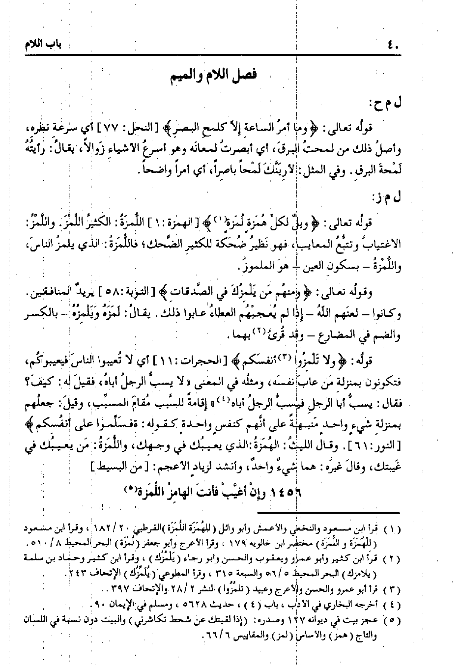 قوله تعالى:} وما أمر الساعة إلا كلمح البصر {[النحل: 77] أي سرعة نظره، وأصل ذلك من لمحت البرق، أي أبصرت لمعانه وهو أسرع الأشياء زوالاً، يقال: رأيته لمحة البرق. وفي المثل: لأرينك لمحًا باصرًا، أي أمرًا واضحًا.