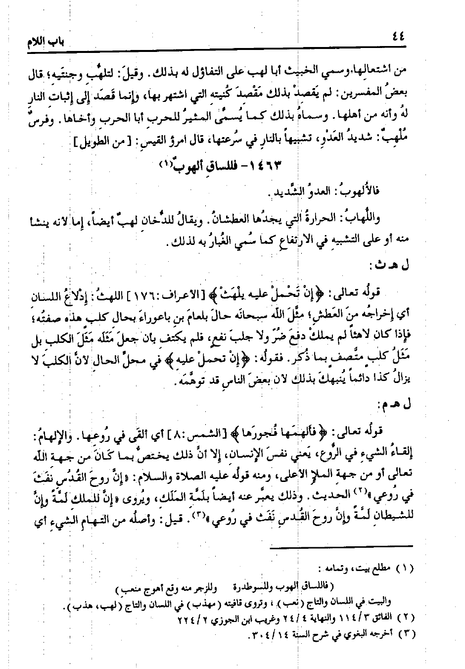 قوله تعالى:} فألهمها فجورها {[الشمس: 8] أي ألقى في روعها. والإلهام: إلقاء الشيء في الروع، يعني نفس الإنسان، إلا أن ذلك يختص بما كان من جهة الله تعالى أو من جهة الملأ الأعلى، ومنه قوله عليه الصلاة والسلام: "إن روح القدس نفث في روعي" الحديث. وذلك يعبر عنه أيضًا بلمة الملك، ويروى "إن للملك لمة وإن للشيطان لمًة وإن روح القدس نفث في روعي". قيل: وأصله من التهام الشيء أي