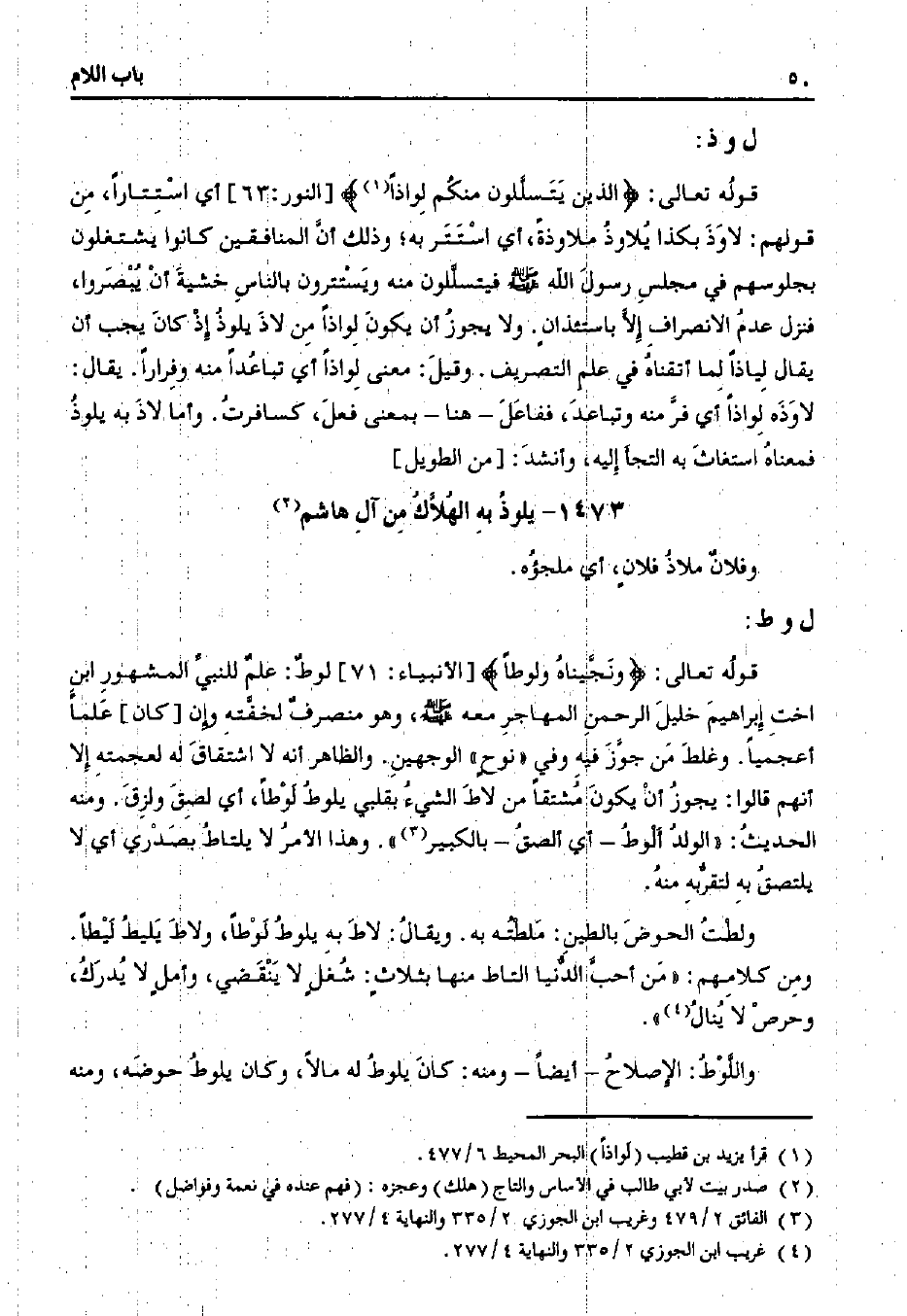 قوله تعالى: {الذين يتسللون منكم لواذًا} [النور: 63] أي استتارًا، من قولهم: لاوذ بكذا يلاوذ ملاوذًة، أي استتر به؛ وذلك أن المنافقين كانوا يشتغلون بجلوسهم في مجلس رسول الله صلى الله عليه وسلم فيتسللون منه ويستترون بالناس خشية أن يبصروا، فنزل عدم الانصراف إلا باستئذانٍ. ولا يجوز أن يكون لواذًا من لاذ يلوذ إذ كان يجب أن يقال لياذًا لما أتقناه في علم التصريف. وقيل: معنى لواذًا أي تباعدًا منه وفرارًا. يقال: لاوذه لواذًا أي فر منه وتباعد، ففاعل - هنا - بمعنى فعل، كسافرت. وأما لاذ به يلوذ فمعناه استغاث به التجأ إليه، وأنشد: [من الطويل]