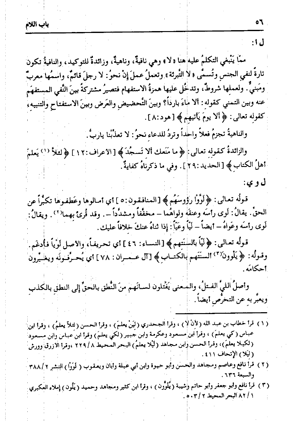 قوله تعالى: {ليًا بألسنتهم} [النساء: 46] أي تحريفًا، والأصل لويًا فأدغم. وقوله: {يلوون ألسنتهم بالكتاب} [آل عمران: 78] أي يحرفونه ويغيرون أحكامه.
