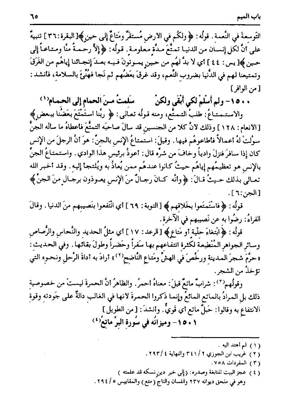 التوسعة في النعمة. قوله: {ولكم في الأرض مستقرٌ ومتاعٌ إلى حين} [البقرة: 36] تنبيهٌ على أن لكل إنسان من الدنيا تمتع مدةٍ معلومةٍ. قوله: {إلا رحمةً منا ومتاعًا إلى حين} [يس: 44] أي لابد لهم من حينٍ يموتون فيه بعد إنجائنا إياهم من الغرق وتمتيعنا لهم في الدنيا بضروب النعم، وقد غرق بعضهم ثم نجا فهنئ بالسلامة، فأنشد [من الوافر]