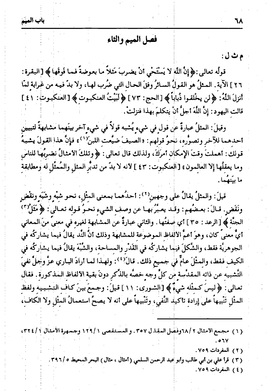 قيل: والمثل يقال على وجهين: أحدهما بمعنى المثل، نحو شِبْهٍ وشَبَهٍ ونقْضٍ ونَقَضٍ. قال: بعضهم: وقد يعبر بها عن وصف الشيء نحو قوله تعالى: {مثل الجنة} [الرعد: 35] أي صفتها. والثاني عبارةٌ عن المشابهة لغيره في معنى من المعاني أي معنىً كان، وهو أعم الألفاظ الموضوعة للمشابهة وذلك أن الند يقال فيما يشاركه في الجوهرية فقط، والشكل فيما يشاركه في القدر والمساحة، والشبه يقال فيما يشاركه في الكيف فقط، والمثل عام في جميع ذلك. قال: ولهذا لما أراد الباري عز وجل نفي التشبيه عن ذاته المقدسةٍ من كل وجهٍ خصه بالذكر دون بقية الألفاظ المذكورة. فقال تعالى: {ليس كمثله شيءٌ} [الشورى: 11] قيل: وجمع بين كاف التشبيه ولفظ المثل تنبيهًا على إرادة تأكيد النفي، وتنبيهًا على أنه لا يصح استعمال المثل ولا الكاف،