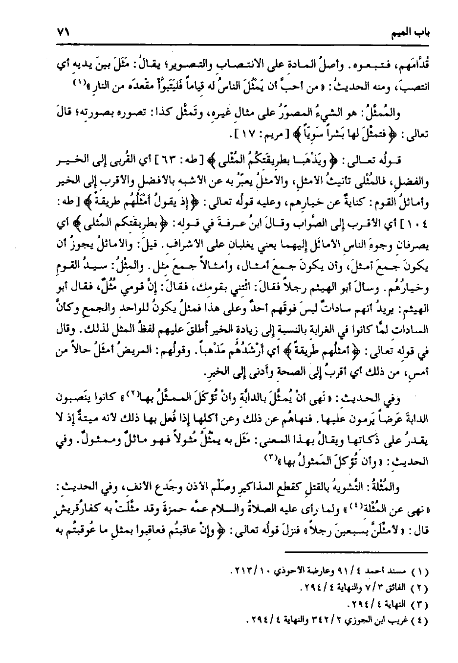 وفي الحديث: «نهى أن يمثل بالدابة وأن تؤكل الممثل بها» كانوا ينصبون الدابة عرضًا يرمون عليها. فنهاهم عن ذلك وعن أكلها إذا فعل بها ذلك لأنه ميتةٌ إذ لا يقدر على ذكاتها ويقال بهذا المعنى: مثل به يمثل مثولًا فهو ماثلٌ وممثولٌ. وفي الحديث: «وأن تؤكل الممثول بها»