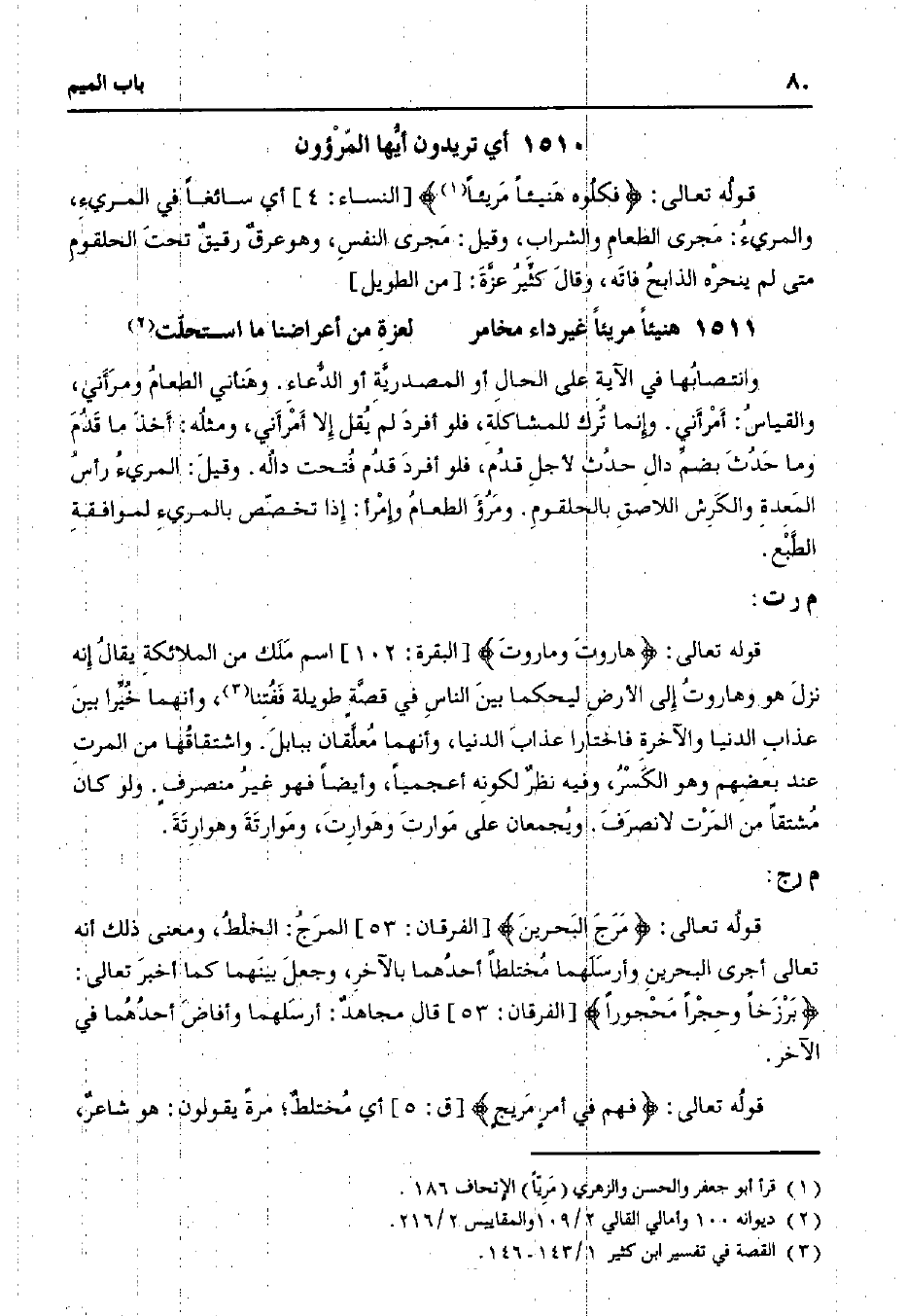 وانتصابها في الآية على الحال والمصدرية أو الدعاء. وهنأني الطعام ومرأني، والقياس: أمرأني. وإنما ترك للمشاكلة، فلو أفرد لم يقل إلا أمرأني، ومثله: أخذ ما قدم وما حدث بضم دال حدث لأجل قدم، فلو أفرد قدم فتحت داله. وقيل: المريء رأس المعدة والكرش اللاصق بالحلقوم. ومرؤ الطعام وإمرأ: إذا تخصص بالمريء لموافقة الطبع.