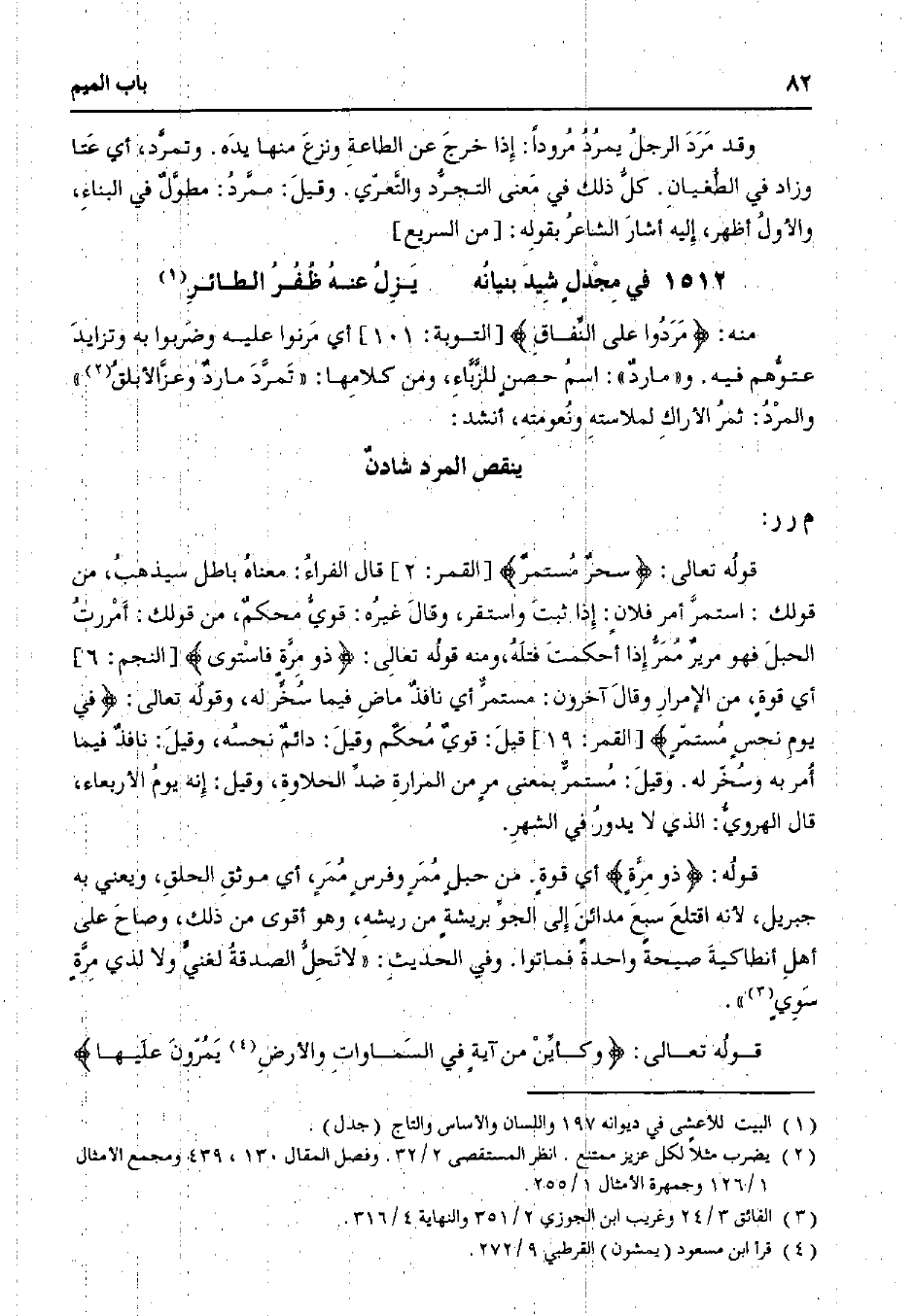 وقد مرد الرجل يمرد مرودًا: إذا خرج عن الطاعة ونزع منها يده. وتمرد، أي عتا وزاد في الطغيان. كل ذلك في معنى التجرد والتعري. وقيل: ممرد: مطول في البناء، والأول أظهر، إليه أشار الشاعر بقوله: [من السريع]