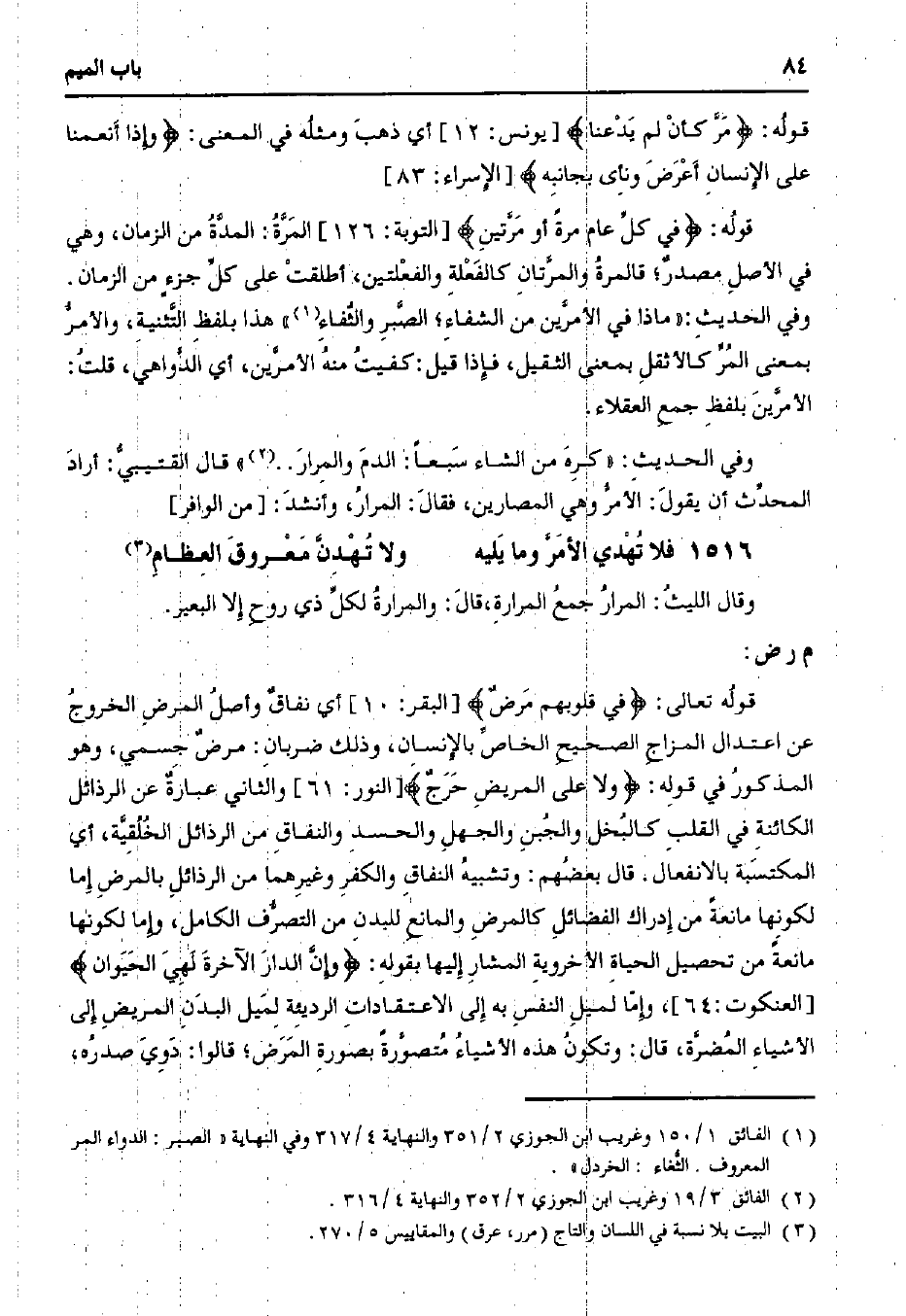 قوله: {في كل عام مرةً أو مرتين} [التوبة: 126] المرة: المدة من الزمان، وهي في الأصل مصدرٌ؛ فالمرة والمرتان كالفعلة والفعلتين، أطلقت على كل جزءٍ من الزمان. وفي الحديث: «ماذا في الأمرين من الشفاء؛ الصبر والثفاء» هذا بلفظ التثنية، والأمر بمعنى المر كالأثقل بمعنى الثقيل، فإذا قيل: كفيت منه الأمرين، أي الدواهي، قلت: الأمرين بلفظ جمع العقلاء.