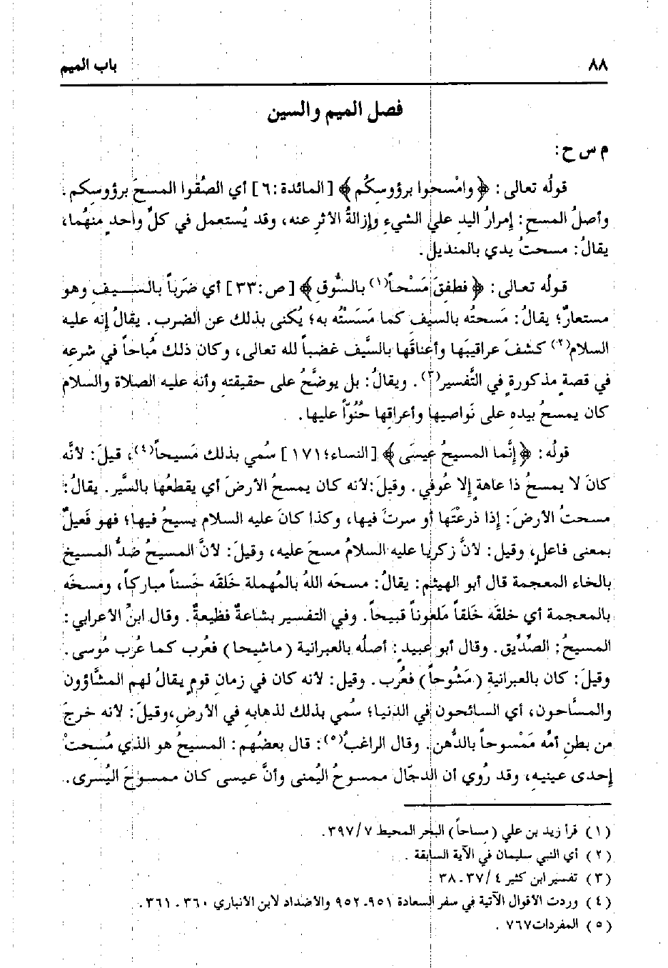 قوله: {إنما المسيح عيسى} [النساء: 171] سمي بذلك مسيحًا، قيل: لأنه كان لا يمسح ذا عاهةٍ إلا عوفي. وقيل: لأنه كان يمسح الأرض أي يقطعها بالسير. يقال: مسحت الأرض: إذا ذرعتها أو سرت فيها، وكذا كان عليه السلام يسيح فيها؛ فهو فعيلٌ بمعنى فاعلٍ، وقيل: لأن زكريا عليه السلام مسح عليه، وقيل: لأنه المسيح ضد المسيخ بالخاء المعجمة قال أبو الهيثم: يقال: مسحه الله بالمهملة خلقه حسنًا مباركًا، ومسخه بالمعجمة أي خلقه خلقًا ملعونًا قبيحًا. وفي التفسير بشاعةٌ فظيعةٌ. وقال ابن الأعرابي: المسيح: الصديق. وقال أبو عبيدٍ: أصله بالعبرانية (ماشيحا) فعرب كما عرب موسى. وقيل: كان بالعبرانية (مشوحًا) فعرب. وقيل: لأنه كان في زمان قومٍ يقال لهم المشاؤون والمساحون، أي السائحون في الدنيا؛ سمي بذلك لذهابه في الأرض، وقيل: لأنه خرج من بطن أمه ممسوحًا بالدهن. وقال الراغب: قال بعضهم: المسيح هو الذي مسحت إحدى عينيه، وقد روي أن الدجال ممسوح اليمنى وأن عيسى كان ممسوح اليسرى.