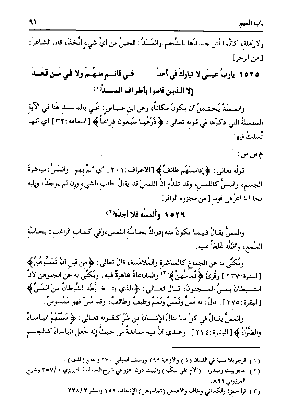 ويكنى به عن الجماع كالمباشرة والملامسة، قال تعالى: {من قبل أن تمسوهن} [البقرة: 237] وقرئ {تماسهن} والمفاعلة ظاهرةٌ فيه. ويكنى به عن الجنوهن لأن الشيطان يمس المجنون، قال تعالى: {الذي يتخبطه الشيطان من المس} [البقرة: 275]. قال: به مسٌ ولمسٌ ولممٌ وطيفٌ وطائفٌ، وقد مس فهو ممسوسٌ.