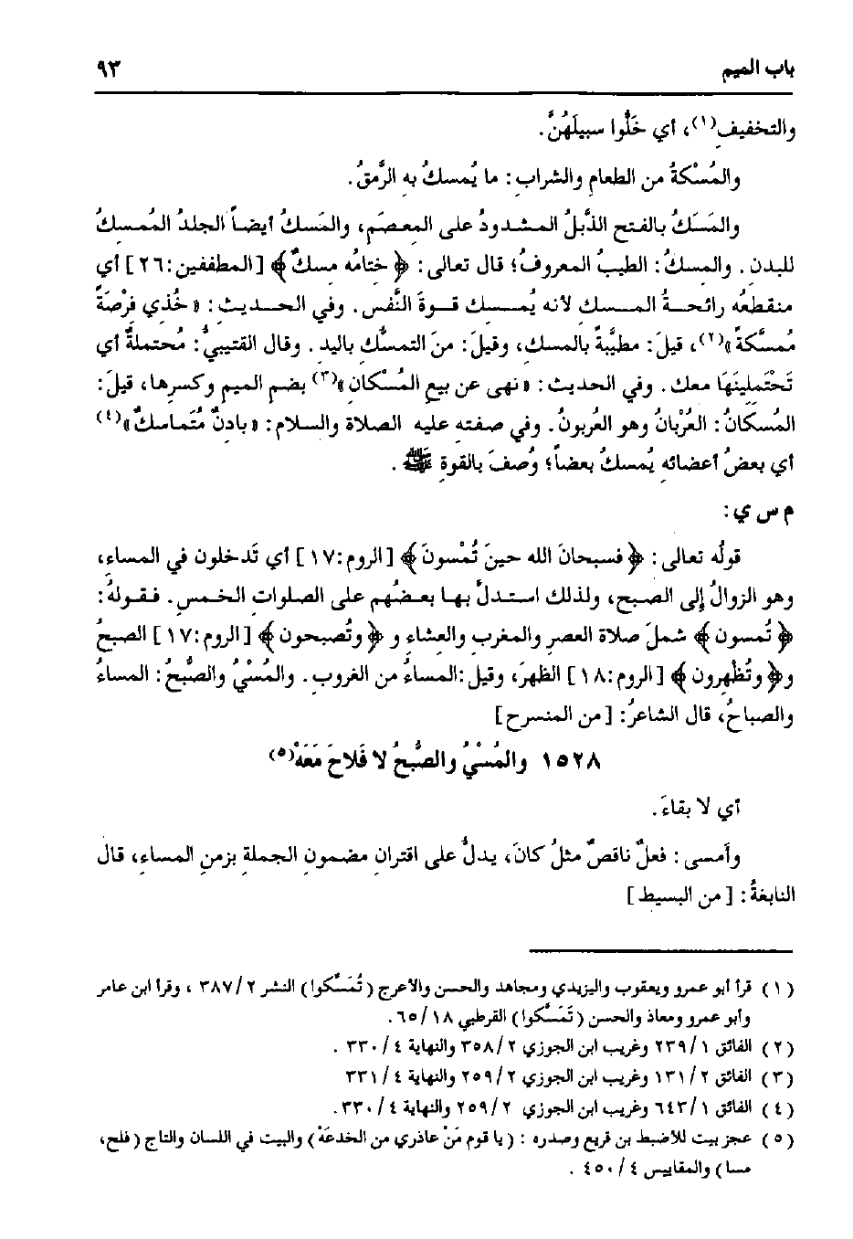 والمسك بالفتح الذبل المشدود على المعصم، والمسك أيضًا الجلد الممسك للبدن. والمسك: الطيب المعروف؛ قال تعالى: {ختامه مسكٌ} [المطففين: 26] أي منقطعه رائحة المسك لأنه يمسك قوة النفس. وفي الحديث: «خذي فرصةً ممسكة»، قيل: مطيبة بالمسك، وقيل: من التمسك باليد. وقال القتيبي: محتملةٌ أي تحتملينها معك. وفي الحديث: «نهى عن بيع المسكان» بضم الميم وكسرها، قيل: المسكان: العربان وهو العربون. وفي صفته عليه الصلاة والسلام: «بادنٌ متماسكٌ» أي بعض أعضائه يمسك بعضًا؛ وصف بالقوة -صلى الله عليه وسلم.