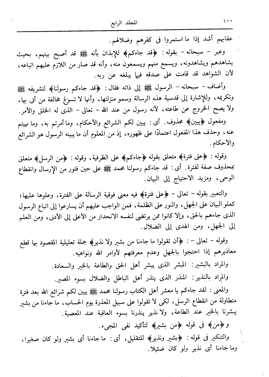 والتعبير بقوله- تعالى- عَلى فَتْرَةٍ فيه معنى فوقيه الرسالة على الفترة، وعلوها عليها كعلوا البيان على الجهل، والنور على الظلمة، فمن الواجب عليهم أن يسارعوا إلى اتباع الرسول الذي جاءهم بالحق، وإلا كانوا ممن يرتضى لنفسه الانحدار من الأعلى إلى الأدنى، ومن العلم إلى الجهل، ومن الهدى إلى الضلال.