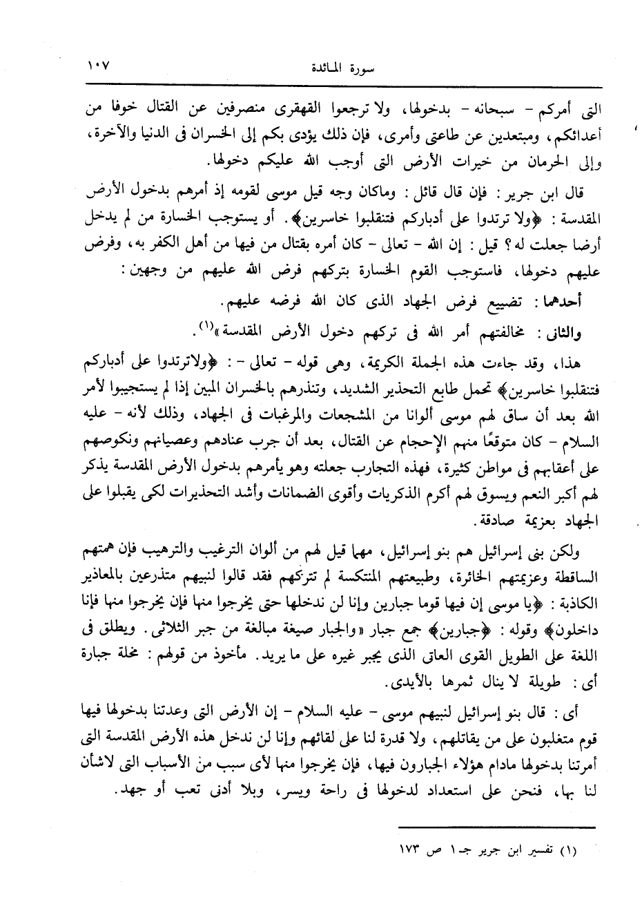 قال ابن جرير: فإن قال قائل: وما كان وجه قول موسى لقومه إذ أمرهم بدخول الأرض المقدسة: وَلا تَرْتَدُّوا عَلى أَدْبارِكُمْ فَتَنْقَلِبُوا خاسِرِينَ. أو يستوجب الخسارة من لم يدخل أرضا جعلت له؟ قيل: إن الله- تعالى- كان أمره بقتال من فيها من أهل يستوجب الخسارة من لم يدخل أرضا جعلت له؟ قيل: إن الله- تعالى- كان أمره بقتال من فيها من أهل الكفر به، وفرض عليهم دخولها، فاستوجب القوم الخسارة بتركهم فرض الله عليهم من وجهين: