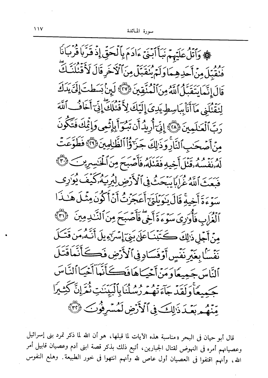 وَاتْلُ عَلَيْهِمْ نَبَأَ ابْنَيْ آدَمَ بِالْحَقِّ إِذْ قَرَّبا قُرْباناً فَتُقُبِّلَ مِنْ أَحَدِهِما وَلَمْ يُتَقَبَّلْ مِنَ الْآخَرِ قالَ لَأَقْتُلَنَّكَ قالَ إِنَّما يَتَقَبَّلُ اللَّهُ مِنَ الْمُتَّقِينَ (27) لَئِنْ بَسَطْتَ إِلَيَّ يَدَكَ لِتَقْتُلَنِي ما أَنَا بِباسِطٍ يَدِيَ إِلَيْكَ لِأَقْتُلَكَ إِنِّي أَخافُ اللَّهَ رَبَّ الْعالَمِينَ (28) إِنِّي أُرِيدُ أَنْ تَبُوءَ بِإِثْمِي وَإِثْمِكَ فَتَكُونَ مِنْ أَصْحابِ النَّارِ وَذلِكَ جَزاءُ الظَّالِمِينَ (29) فَطَوَّعَتْ لَهُ نَفْسُهُ قَتْلَ أَخِيهِ فَقَتَلَهُ فَأَصْبَحَ مِنَ الْخاسِرِينَ (30) فَبَعَثَ اللَّهُ غُراباً يَبْحَثُ فِي الْأَرْضِ لِيُرِيَهُ كَيْفَ يُوارِي سَوْأَةَ أَخِيهِ قالَ يا وَيْلَتى أَعَجَزْتُ أَنْ أَكُونَ مِثْلَ هذَا الْغُرابِ فَأُوارِيَ سَوْأَةَ أَخِي فَأَصْبَحَ مِنَ النَّادِمِينَ (31)