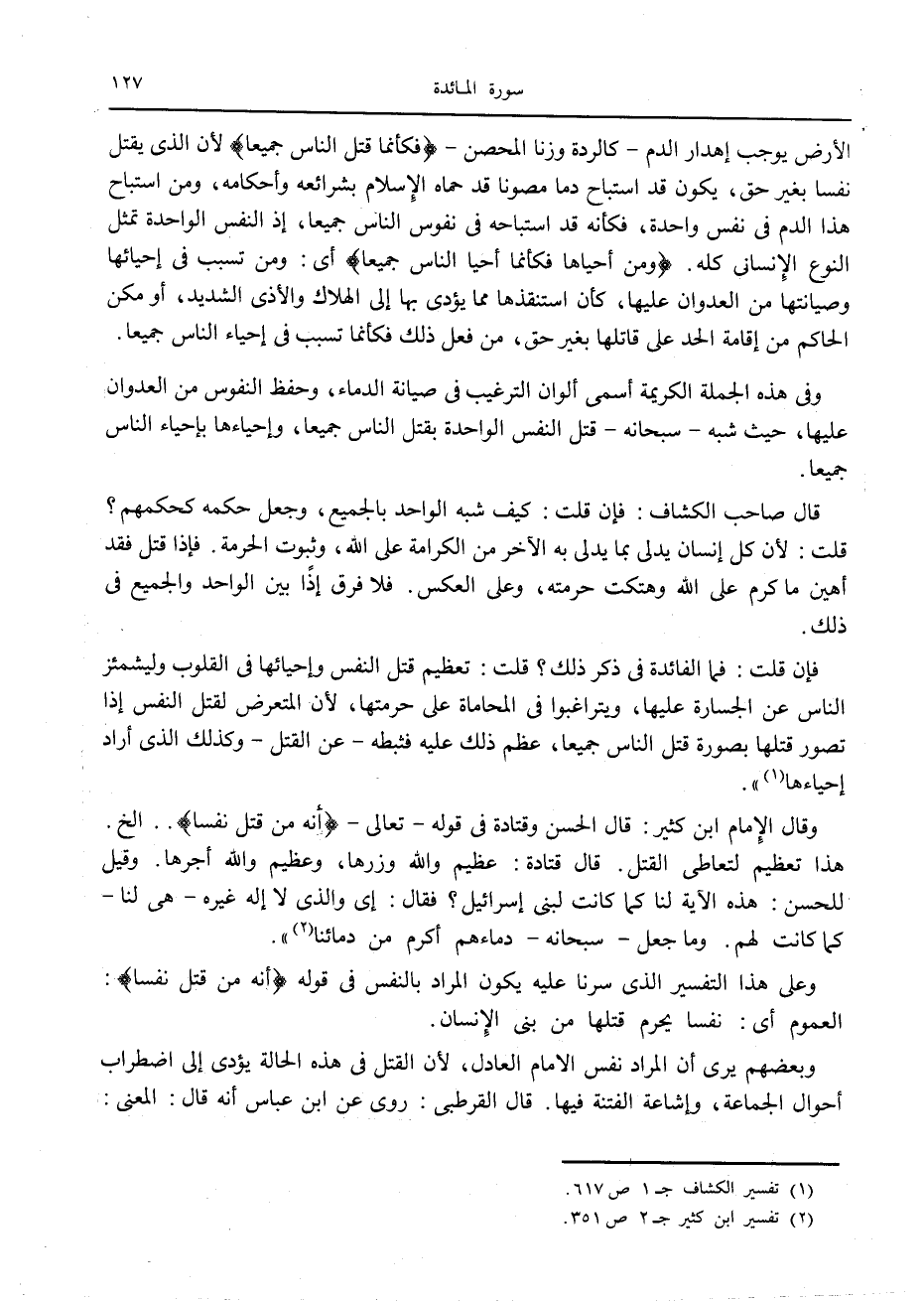 الأرض يوجب إهدار الدم- كالردة وزنا المحصن- فَكَأَنَّما قَتَلَ النَّاسَ جَمِيعاً لأن الذي يقتل نفسا بغير حق، يكون قد استباح دما مصونا قد حماه الإسلام بشرائعه وأحكامه، ومن استباح هذا الدم في نفس واحدة، فكأنه قد استباحه في نفوس الناس جميعا، إذ النفس الواحدة تمثل النوع الإنسانى كله. وَمَنْ أَحْياها فَكَأَنَّما أَحْيَا النَّاسَ جَمِيعاً أى: ومن تسبب في إحيائها وصيانتها من العدوان عليها، كأن استنقذها مما يؤدى بها إلى الهلاك والأذى الشديد، أو مكن الحاكم من إقامة الحد على قاتلها بغير حق، من فعل ذلك فكأنما تسبب في إحياء الناس جميعا.