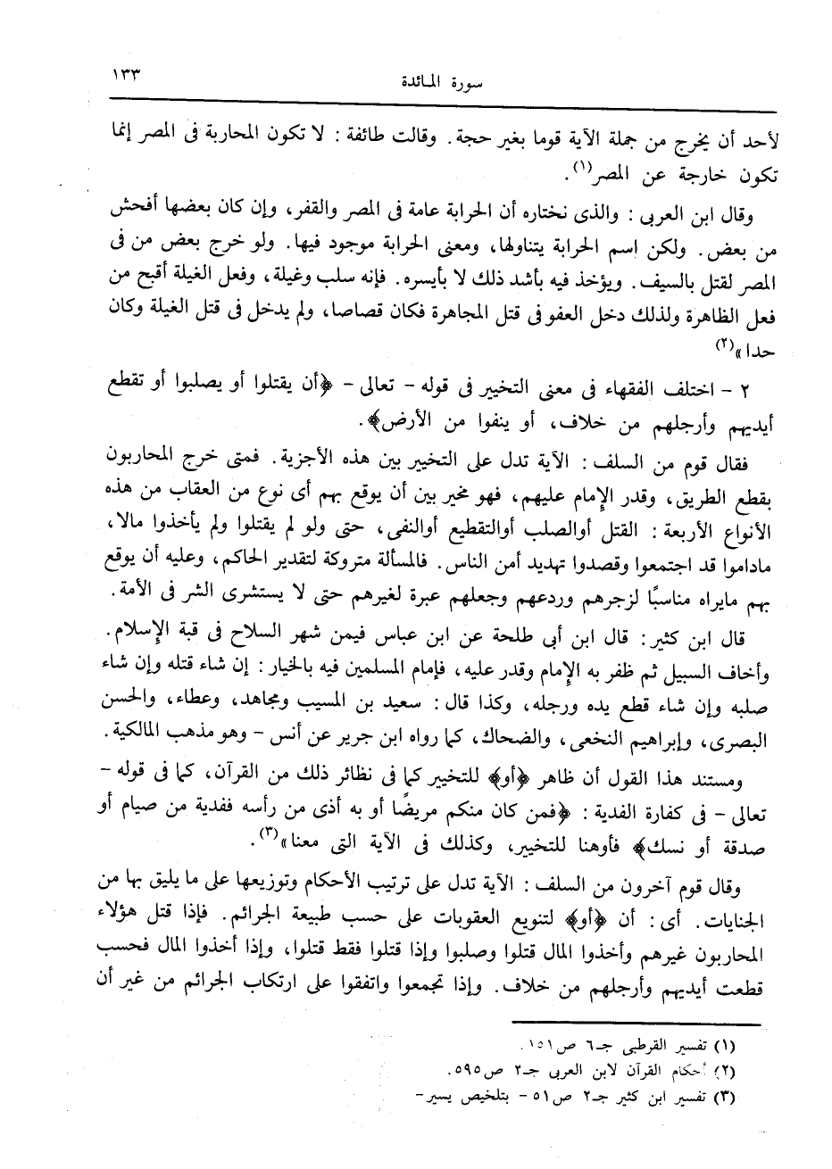 وقال ابن العربي: والذي نختاره أن الحرابة عامة في المصر والقفر، وإن كان بعضها أفحش من بعض. ولكن اسم الحرابة يتناولها، ومعنى الحرابة موجود فيها. ولو خرج بعض من في المصر لقتل بالسيف. ويؤخذ فيه بأشد ذلك لا بأيسره. فإنه سلب وغيلة، وفعل الغيلة أقبح من فعل الظاهرة ولذلك دخل العفو في قتل المجاهرة فكان قصاصا، ولم يدخل في قتل الغيلة وكان حدا» «2» 2- اختلف الفقهاء في معنى التخيير في قوله- تعالى- أَنْ يُقَتَّلُوا أَوْ يُصَلَّبُوا أَوْ تُقَطَّعَ أَيْدِيهِمْ وَأَرْجُلُهُمْ مِنْ خِلافٍ، أَوْ يُنْفَوْا مِنَ الْأَرْضِ.
