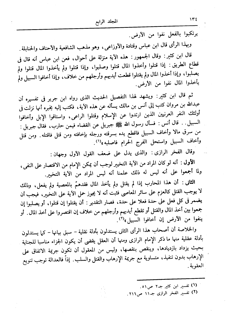 قال ابن كثير: وقال الجمهور: هذه الآية منزلة على أحوال، فعن ابن عباس أنه قال في قطاع الطريق: إذا قتلوا وأخذوا المال قتلوا وصلبوا، وإذا قتلوا ولم يأخذوا المال قتلوا ولم يصلبوا، وإذا أخذوا المال ولم يقتلوا قطعت أيديهم وأرجلهم من خلاف، وإذا أخافوا السبيل ولم يأخذوا المال نفوا من الأرض.