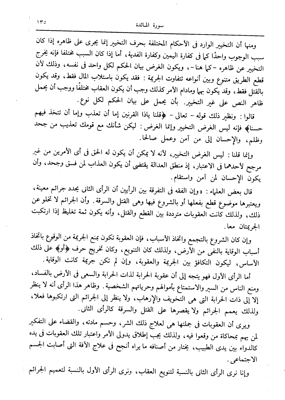 ومنها أن التخيير الوارد في الأحكام المختلفة بحرف التخيير إنما يجرى على ظاهره إذا كان سبب الوجوب واحدا كما في كفارة اليمين وكفارة الفدية، أما إذا كان السبب مختلفا فإنه يخرج التخيير عن ظاهره- كما هنا-، ويكون الغرض بيان الحكم لكل واحد في نفسه، وذلك لأن قطع الطريق متنوع وبين أنواعه تتفاوت الجريمة: فقد يكون باستلاب المال فقط، وقد يكون بالقتل فقط، وقد يكون بهما ومادام الأمر كذلك وجب أن يكون العقاب مختلفا ووجب أن يحمل ظاهر النص على غير التخيير. بأن يحمل على بيان الحكم لكل نوع.