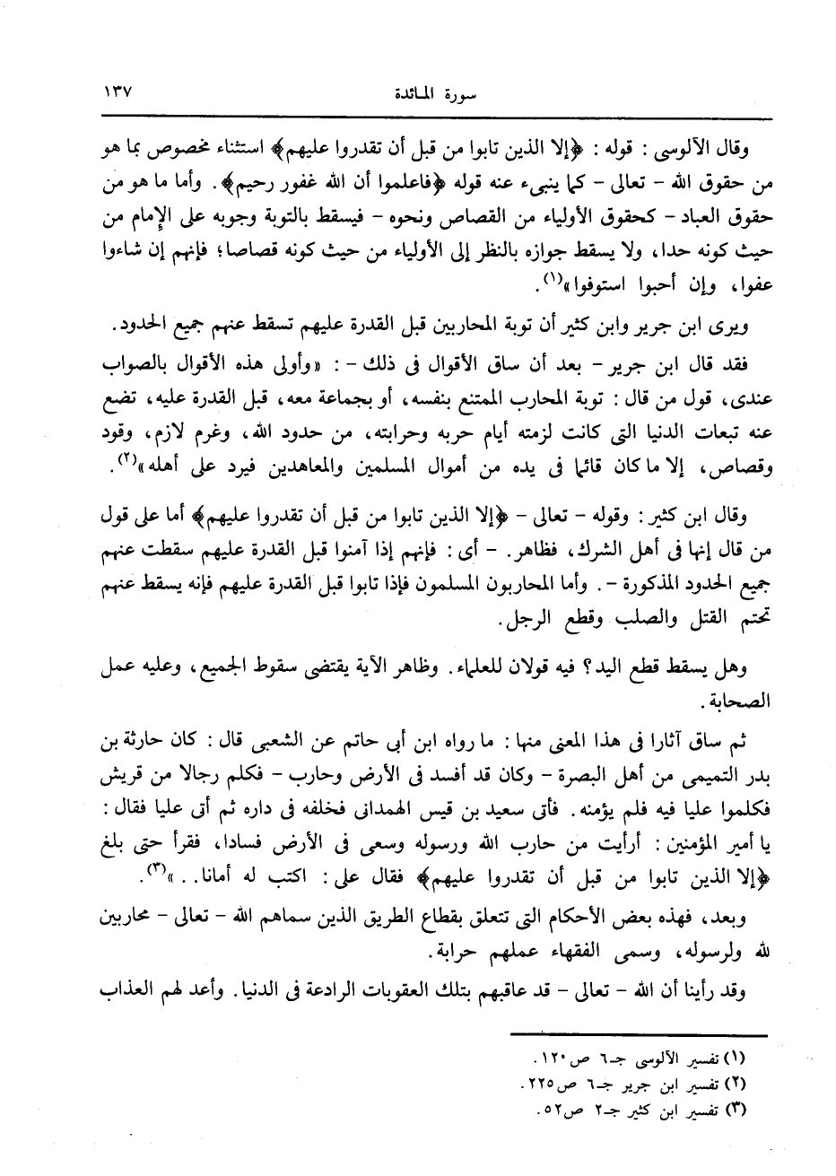 وقال الآلوسى: قوله: إِلَّا الَّذِينَ تابُوا مِنْ قَبْلِ أَنْ تَقْدِرُوا عَلَيْهِمْ استثناء مخصوص بما هو من حقوق الله- تعالى- كما ينبئ عنه قوله فَاعْلَمُوا أَنَّ اللَّهَ غَفُورٌ رَحِيمٌ. وأما ما هو من حقوق العباد- كحقوق الأولياء من القصاص ونحوه- فيسقط بالتوبة وجوبه على الإمام من حيث كونه حدا، ولا يسقط جوازه بالنظر إلى الأولياء من حيث كونه قصاصا فإنهم إن شاءوا عفوا، وإن أحبوا استوفوا» «1» .