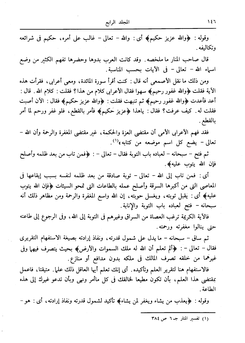 فقد فهم الأعرابى الأمى أن مقتضى العزة والحكمة، غير مقتضى المغفرة والرحمة وأن الله- تعالى- يضع كل اسم موضعه من كتابه» «1» .