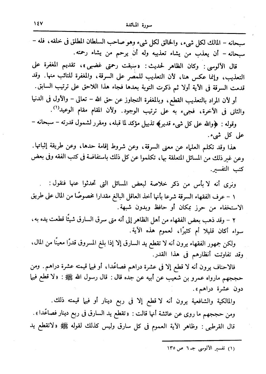 قال القرطبي: وظاهر الآية العموم في كل سارق وليس كذلك لقوله صلى الله عليه وسلم «لا تقطع يد