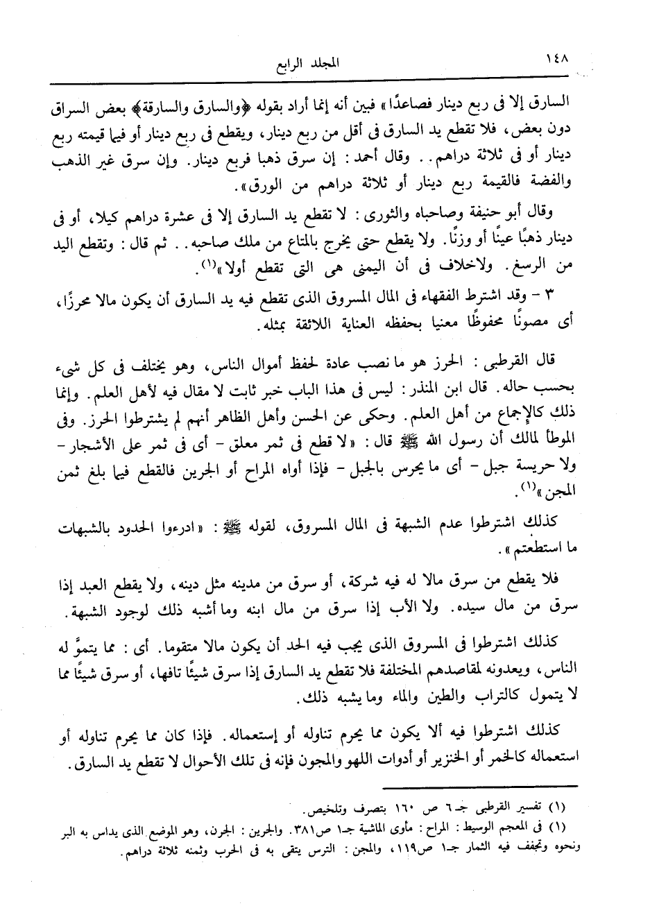 3- وقد اشترط الفقهاء في المال المسروق الذي تقطع فيه يد السارق أن يكون ما لا محرزا، أى مصونا محفوظا معنيا بحفظه العناية اللائقة بمثله.