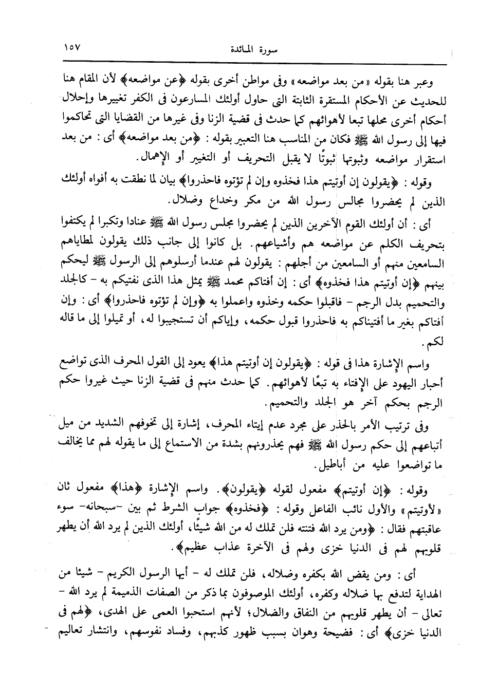 وقوله: إِنْ أُوتِيتُمْ مفعول لقوله قَدِيرٌ. واسم الإشارة يَقُولُونَ مفعول ثان «لأوتيتم» والأول نائب الفاعل وقوله: فَخُذُوهُ جواب الشرط ثم بين- سبحانه- سوء عاقبتهم فقال: وَمَنْ يُرِدِ اللَّهُ فِتْنَتَهُ فَلَنْ تَمْلِكَ لَهُ مِنَ اللَّهِ شَيْئاً، أُولئِكَ الَّذِينَ لَمْ يُرِدِ اللَّهُ أَنْ يُطَهِّرَ قُلُوبَهُمْ لَهُمْ فِي الدُّنْيا خِزْيٌ وَلَهُمْ فِي الْآخِرَةِ عَذابٌ عَظِيمٌ.