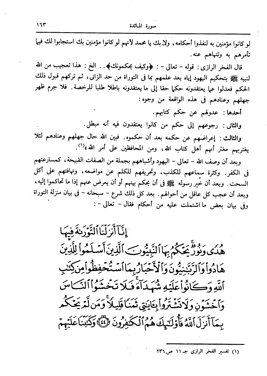 وبعد أن وصف الله- تعالى- اليهود وأشباههم بجملة من الصفات القبيحة، كمسارعتهم في الكفر. وكثرة سماعهم للكذب، وتحريفهم للكلم عن مواضعه، وتهافتهم على أكل أسحت. وبعد أن خير رسوله صلى الله عليه وسلم في أن يحكم بينهم أو أن يعرض عنهم إذا ما تحاكموا إليه، وبعد أن عجب كل عاقل من أحوالهم. بعد كل ذلك شرع- سبحانه- في بيان منزلة التوراة وفي بيان بعض ما اشتملت عليه من أحكام فقال- تعالى-: