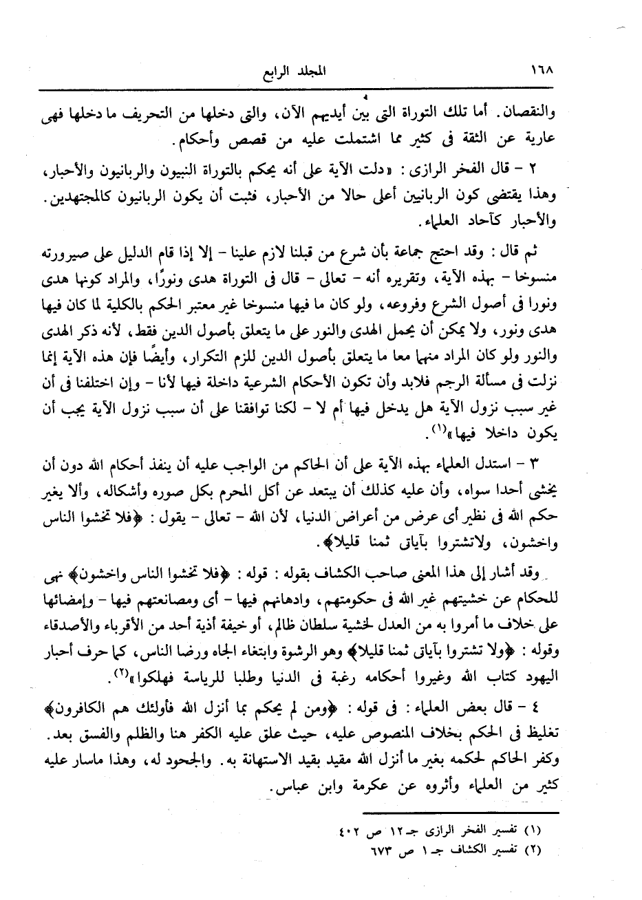 2- قال الفخر الرازي: «دلت الآية على أنه يحكم بالتوراة النبيون والربانيون والأحبار، وهذا يقتضى كون الربانيين أعلى حالا من الأحبار، فثبت أن يكون الربانيون كالمجتهدين.