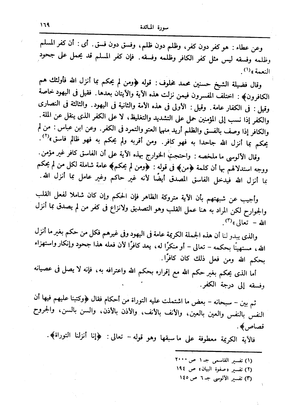 وقال فضيلة الشيخ حسنين محمد مخلوف: قوله وَمَنْ لَمْ يَحْكُمْ بِما أَنْزَلَ اللَّهُ فَأُولئِكَ هُمُ الْكافِرُونَ: اختلف المفسرون فيمن نزلت هذه الآية والآيتان بعدها. فقيل في اليهود خاصة وقيل: في الكفار عامة. وقيل: الأولى في هذه الأمة والثانية في اليهود. والثالثة في النصارى والكفر إذا نسب إلى المؤمنين حمل على التشديد والتغليظ، لا على الكفر الذي ينقل عن الملة.