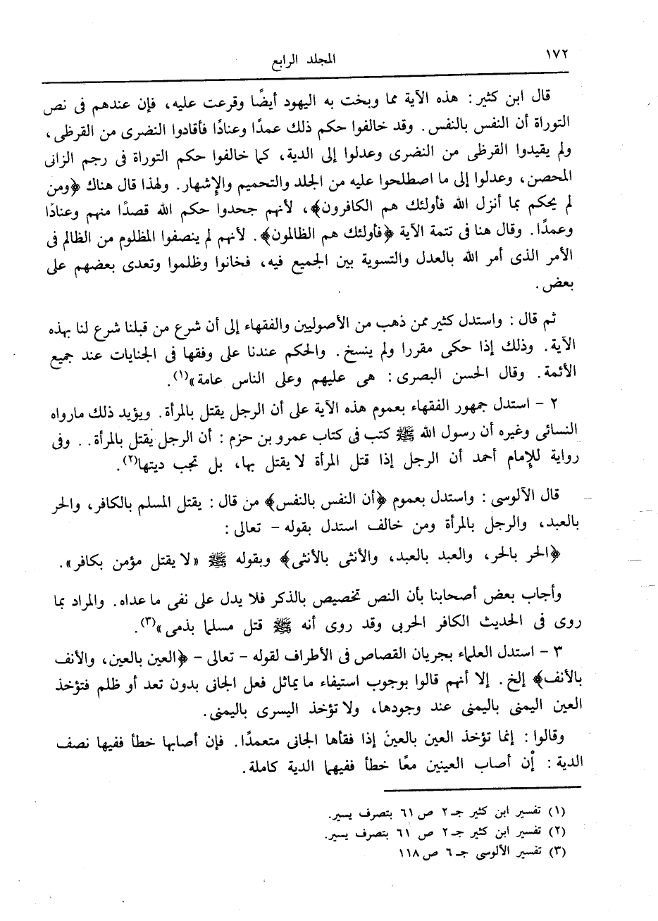 قال الآلوسى: واستدل بعموم أَنَّ النَّفْسَ بِالنَّفْسِ من قال: يقتل المسلم بالكافر، والحر بالعبد، والرجل بالمرأة ومن خالف استدل بقوله- تعالى: