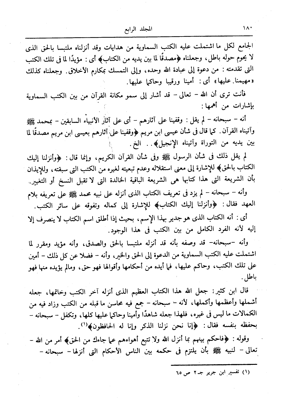 قال ابن كثير: جعل الله هذا الكتاب العظيم الذي أنزله آخر الكتب وخاتمها، جعله أشملها وأعظمها وأكملها، لأنه- سبحانه- جمع فيه محاسن ما قبله من الكتب وزاد فيه من الكمالات ما ليس في غيره، فلهذا جعله شاهدا وأمينا وحاكما عليها كلها، وتكفل- سبحانه- بحفظه بنفسه فقال: إِنَّا نَحْنُ نَزَّلْنَا الذِّكْرَ وَإِنَّا لَهُ لَحافِظُونَ «1» .