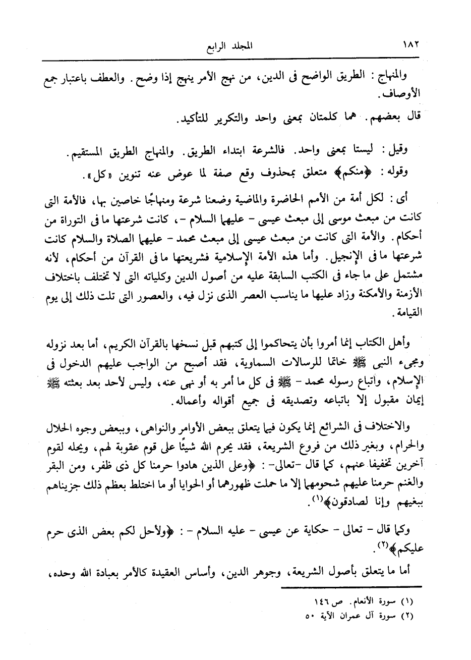 والاختلاف في الشرائع إنما يكون فيما يتعلق ببعض الأوامر والنواهي، وببعض وجوه الحلال والحرام، وبغير ذلك من فروع الشريعة، فقد يحرم الله شيئا على قوم عقوبة لهم، ويحله لقوم آخرين تخفيفا عنهم، كما قال- تعالى-: وَعَلَى الَّذِينَ هادُوا حَرَّمْنا كُلَّ ذِي ظُفُرٍ، وَمِنَ الْبَقَرِ وَالْغَنَمِ حَرَّمْنا عَلَيْهِمْ شُحُومَهُما إِلَّا ما حَمَلَتْ ظُهُورُهُما أَوِ الْحَوايا أَوْ مَا اخْتَلَطَ بِعَظْمٍ ذلِكَ جَزَيْناهُمْ بِبَغْيِهِمْ وَإِنَّا لَصادِقُونَ «1» .