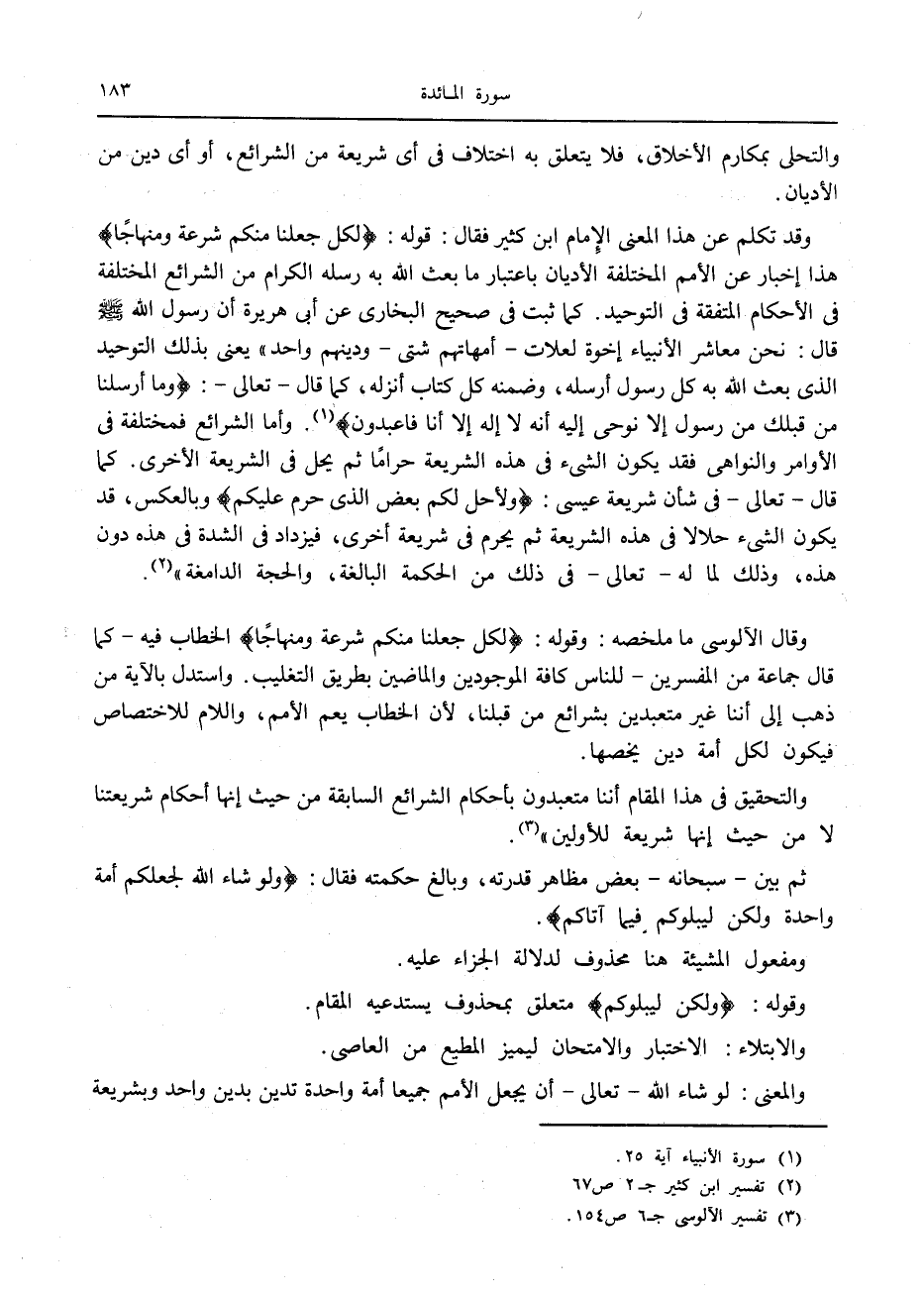 وقد تكلم عن هذا المعنى الإمام ابن كثير فقال: قوله: لِكُلٍّ جَعَلْنا مِنْكُمْ شِرْعَةً وَمِنْهاجاً هذا إخبار عن الأمم المختلفة الأديان باعتبار ما بعث الله به رسله الكرام من الشرائع المختلفة في الأحكام المتفقة في التوحيد. كما ثبت في صحيح البخاري عن أبى هريرة أن رسول الله صلى الله عليه وسلم قال: نحن معاشر الأنبياء إخوة لعلات- أمهاتهم شتى- ودينهم واحد» يعنى بذلك التوحيد الذي بعث الله به كل رسول أرسله، وضمنه كل كتاب أنزله، كما قال- تعالى-: وَما أَرْسَلْنا مِنْ قَبْلِكَ مِنْ رَسُولٍ إِلَّا نُوحِي إِلَيْهِ أَنَّهُ لا إِلهَ إِلَّا أَنَا فَاعْبُدُونِ «1» . وأما الشرائع فمختلفة في الأوامر والنواهي فقد يكون الشيء في هذه الشريعة حراما ثم يحل في الشريعة الأخرى. كما قال- تعالى- في شأن شريعة عيسى: وَلِأُحِلَّ لَكُمْ بَعْضَ الَّذِي حُرِّمَ عَلَيْكُمْ وبالعكس، قد يكون الشيء حلالا في هذه الشريعة ثم يحرم في شريعة أخرى، فيزداد في الشدة في هذه دون هذه، وذلك لما له- تعالى- في ذلك من الحكمة البالغة، والحجة الدامغة» «2» .