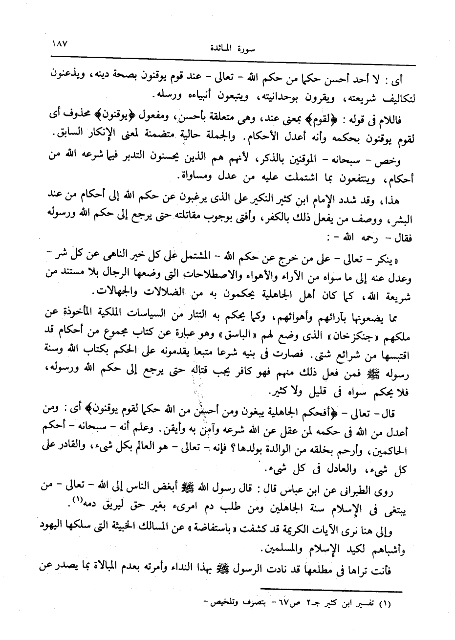 «ينكر- تعالى- على من خرج عن حكم الله- المشتمل على كل خير الناهي عن كل شر- وعدل عنه إلى ما سواه من الآراء والأهواء والإصلاحات التي وضعها الرجال بلا مستند من شريعة الله، كما كان أهل الجاهلية يحكمون به من الضلالات والجهالات.
