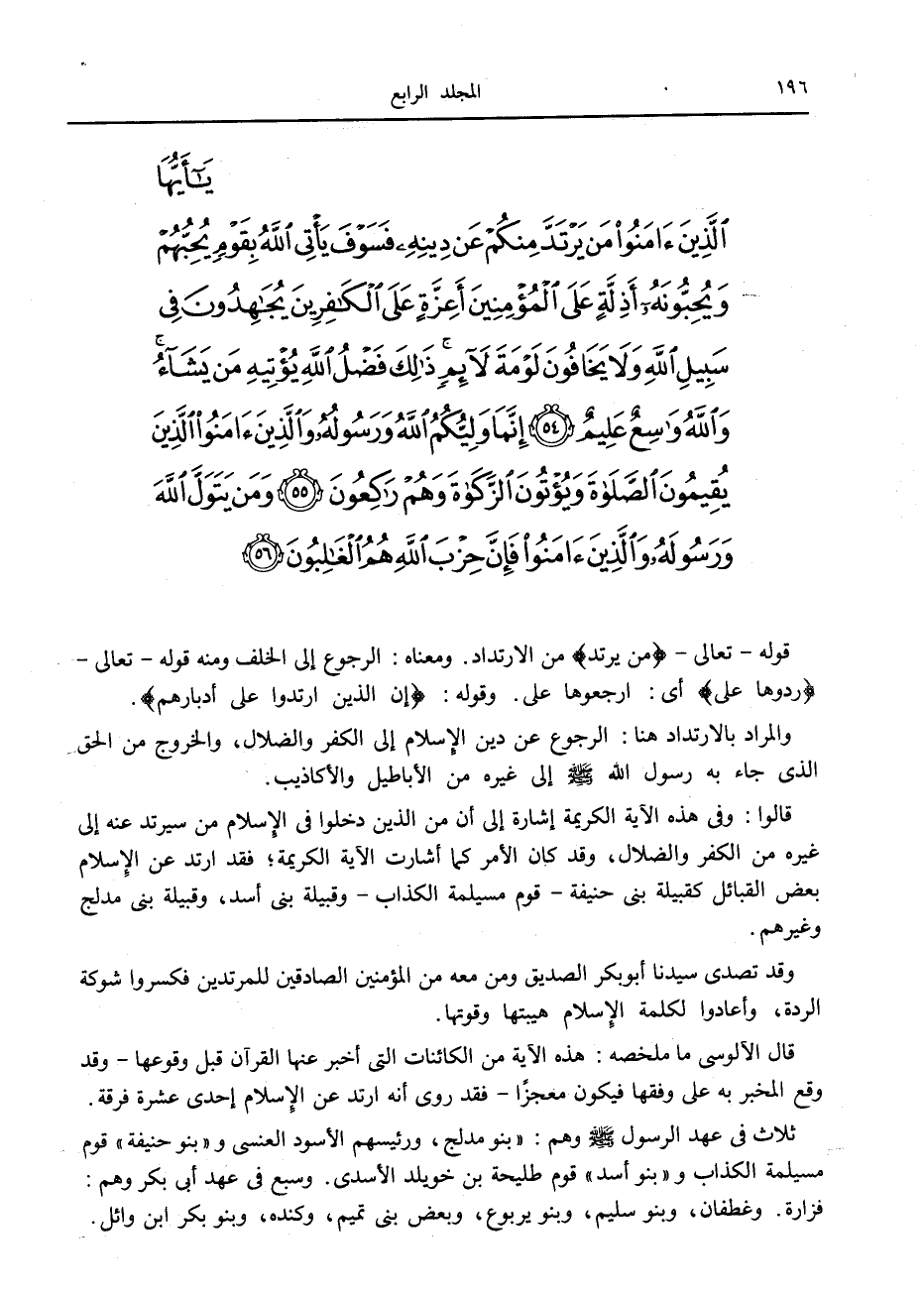 يا أَيُّهَا الَّذِينَ آمَنُوا مَنْ يَرْتَدَّ مِنْكُمْ عَنْ دِينِهِ فَسَوْفَ يَأْتِي اللَّهُ بِقَوْمٍ يُحِبُّهُمْ وَيُحِبُّونَهُ أَذِلَّةٍ عَلَى الْمُؤْمِنِينَ أَعِزَّةٍ عَلَى الْكافِرِينَ يُجاهِدُونَ فِي سَبِيلِ اللَّهِ وَلا يَخافُونَ لَوْمَةَ لائِمٍ ذلِكَ فَضْلُ اللَّهِ يُؤْتِيهِ مَنْ يَشاءُ وَاللَّهُ واسِعٌ عَلِيمٌ (54) إِنَّما وَلِيُّكُمُ اللَّهُ وَرَسُولُهُ وَالَّذِينَ آمَنُوا الَّذِينَ يُقِيمُونَ الصَّلاةَ وَيُؤْتُونَ الزَّكاةَ وَهُمْ راكِعُونَ (55) وَمَنْ يَتَوَلَّ اللَّهَ وَرَسُولَهُ وَالَّذِينَ آمَنُوا فَإِنَّ حِزْبَ اللَّهِ هُمُ الْغالِبُونَ (56)