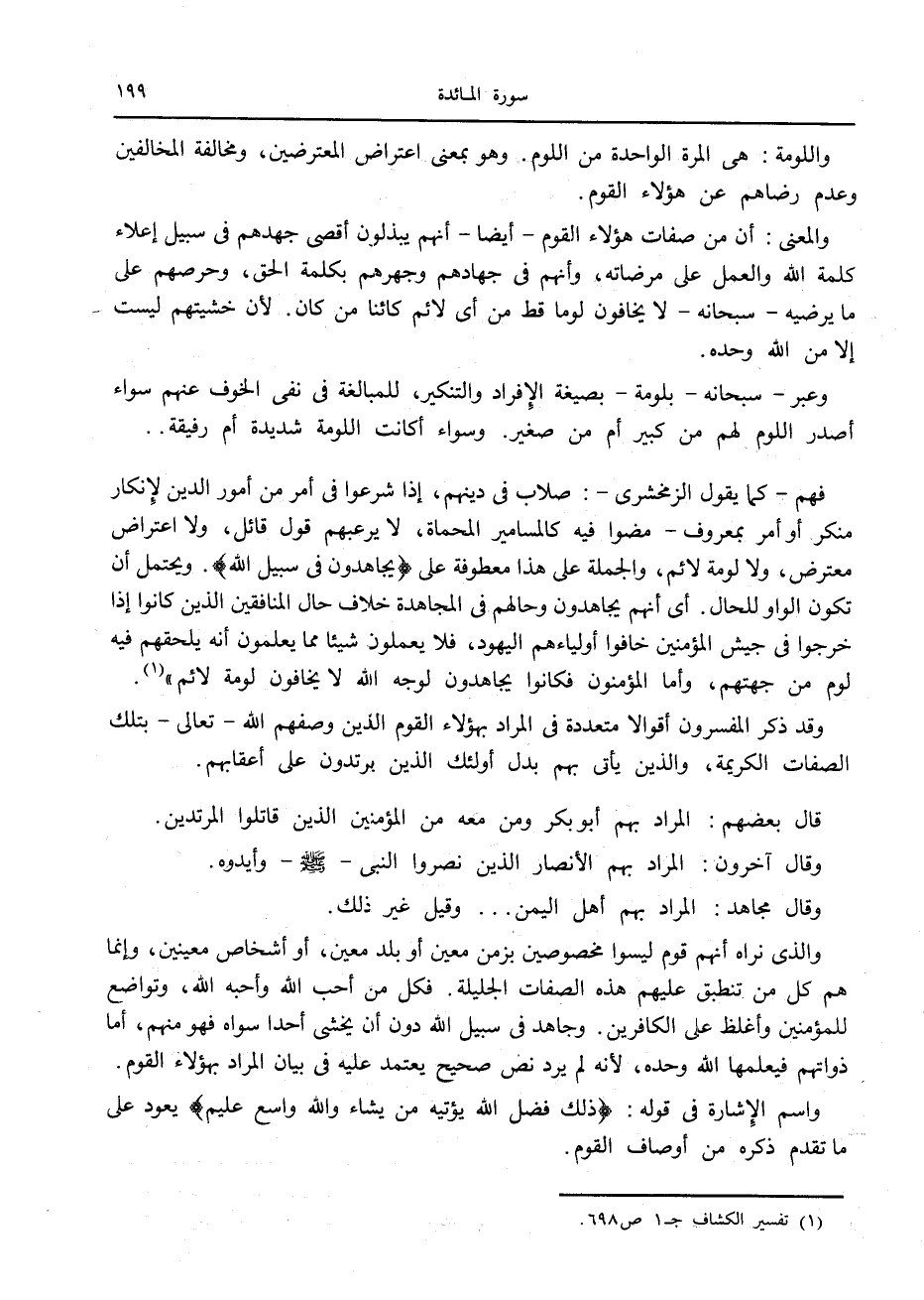 فهم- كما يقول الزمخشري-: صلاب في دينهم، إذا شرعوا في أمر من أمور الدين لإنكار منكر أو أمر بمعروف- مضوا فيه كالمسامير المحماة، لا يرعبهم قول قائل، ولا اعتراض معترض، ولا لومة لائم، والجملة على هذا معطوفة على يُجاهِدُونَ فِي سَبِيلِ اللَّهِ. ويحتمل أن تكون الواو للحال. أى أنهم يجاهدون وحالهم في المجاهدة خلاف حال المنافقين الذين كانوا إذا خرجوا في جيش المؤمنين خافوا أولياءهم اليهود، فلا يعملون شيئا مما يعلمون أنه يلحقهم فيه لوم من جهتهم، وأما المؤمنون فكانوا يجاهدون لوجه الله لا يخافون لومة لائم» «1» .