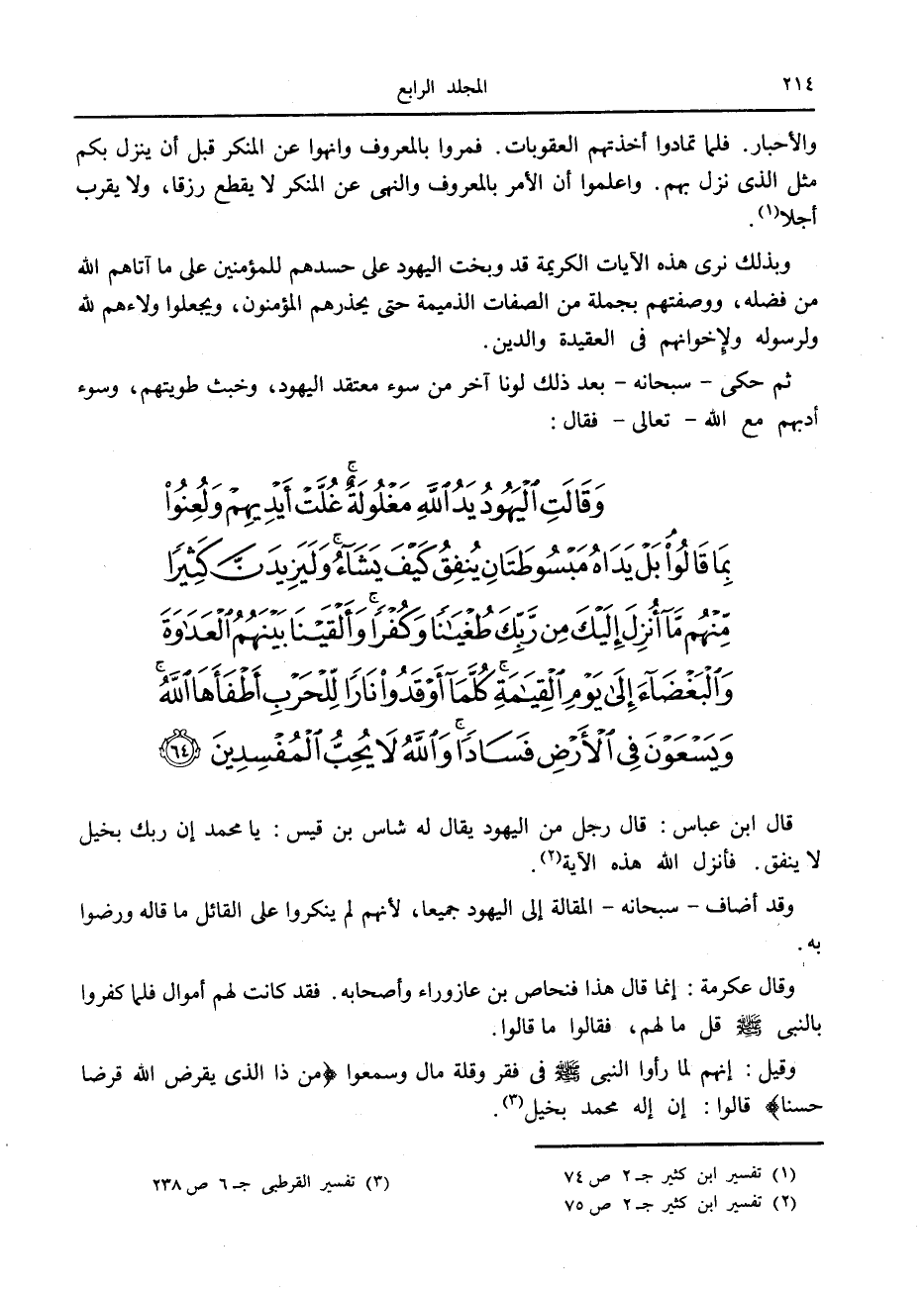 وَقالَتِ الْيَهُودُ يَدُ اللَّهِ مَغْلُولَةٌ غُلَّتْ أَيْدِيهِمْ وَلُعِنُوا بِما قالُوا بَلْ يَداهُ مَبْسُوطَتانِ يُنْفِقُ كَيْفَ يَشاءُ وَلَيَزِيدَنَّ كَثِيراً مِنْهُمْ ما أُنْزِلَ إِلَيْكَ مِنْ رَبِّكَ طُغْياناً وَكُفْراً وَأَلْقَيْنا بَيْنَهُمُ الْعَداوَةَ وَالْبَغْضاءَ إِلى يَوْمِ الْقِيامَةِ كُلَّما أَوْقَدُوا ناراً لِلْحَرْبِ أَطْفَأَهَا اللَّهُ وَيَسْعَوْنَ فِي الْأَرْضِ فَساداً وَاللَّهُ لا يُحِبُّ الْمُفْسِدِينَ (64)