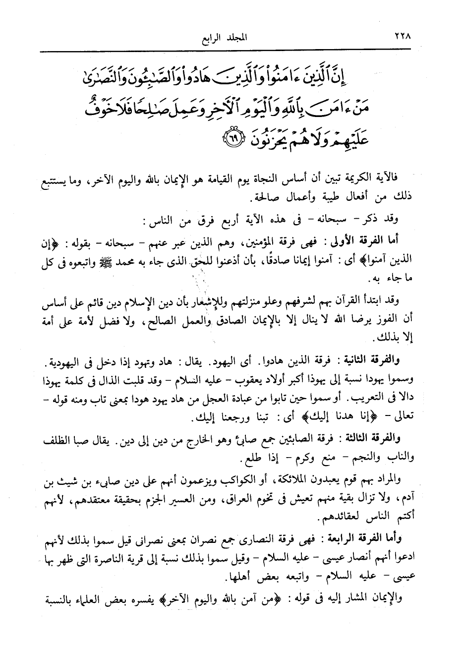 إِنَّ الَّذِينَ آمَنُوا وَالَّذِينَ هادُوا وَالصَّابِئُونَ وَالنَّصارى مَنْ آمَنَ بِاللَّهِ وَالْيَوْمِ الْآخِرِ وَعَمِلَ صالِحاً فَلا خَوْفٌ عَلَيْهِمْ وَلا هُمْ يَحْزَنُونَ (69)