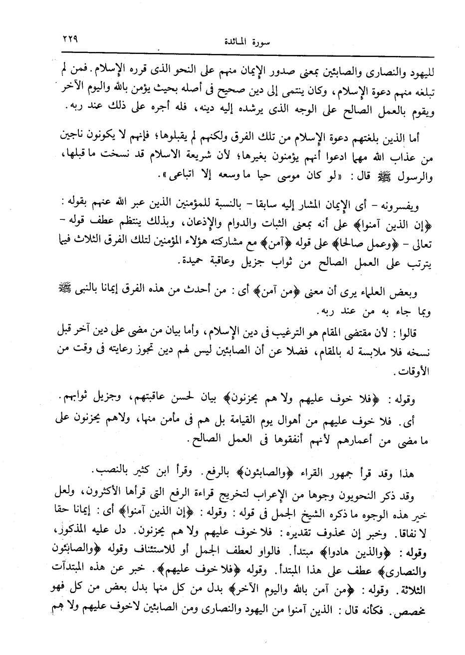 وقد ذكر النحويون وجوها من الإعراب لتخريج قراءة الرفع التي قرأها الأكثرون، ولعل خير هذه الوجوه ما ذكره الشيخ الجمل في قوله: وقوله: إِنَّ الَّذِينَ آمَنُوا أى: إيمانا حقا لا نفاقا. وخبر إن محذوف تقديره: فلا خوف عليهم ولا هم يحزنون. دل عليه المذكور، وقوله: وَالَّذِينَ هادُوا مبتدأ. فالواو لعطف الجمل أو للاستئناف وقوله وَالصَّابِئُونَ وَالنَّصارى عطف على هذا المبتدأ. وقوله فَلا خَوْفٌ عَلَيْهِمْ. خبر عن هذه المبتدءات الثلاثة. وقوله: مَنْ آمَنَ بِاللَّهِ وَالْيَوْمِ الْآخِرِ بدل من كل منها بدل بعض من كل فهو مخصص. فكأنه قال: الذين آمنوا من اليهود والنصارى ومن الصابئين لا خوف عليهم ولا هم