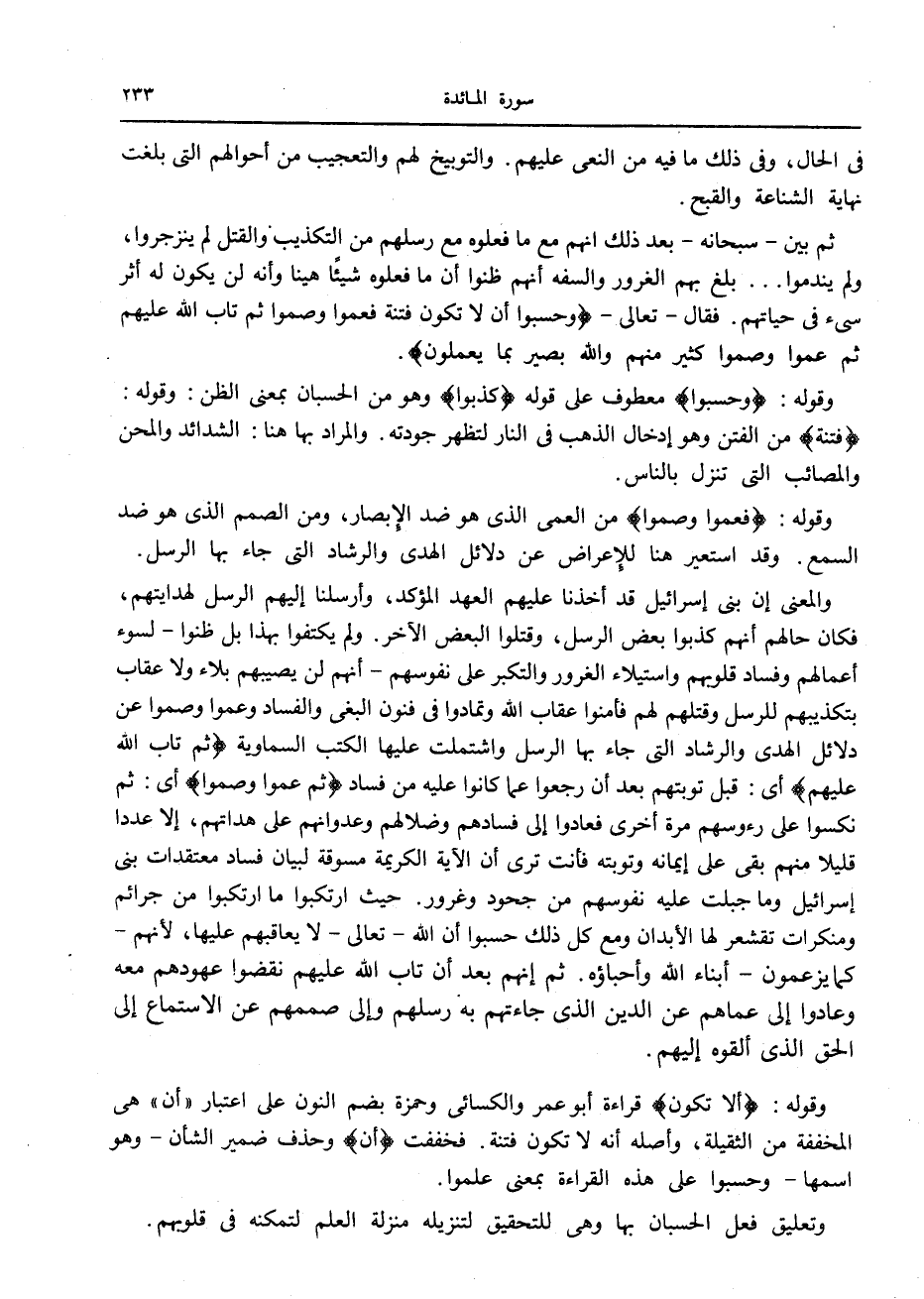 وقوله: أَلَّا تَكُونَ قراءة أبو عمر والكسائي وحمزة بضم النون على اعتبار «أن» هي المخففة من الثقيلة، وأصله أنه لا تكون فتنة. فخففت أن وحذف ضمير الشأن- وهو اسمها- وحسبوا على هذه القراءة بمعنى علموا.