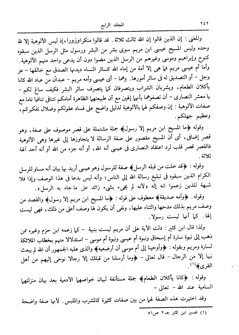 وقوله مَا الْمَسِيحُ ابْنُ مَرْيَمَ إِلَّا رَسُولٌ جملة مشتملة على قصر موصوف على صفة، وهو قصر إضافى، أى أن المسيح مقصور على صفة الرسالة لا يتجاوزها إلى غيرها وهي الألوهية فالقصر قصر قلب لرد اعتقاد النصارى في عيسى أنه الله، أو أنه جزء من الله أو أنه أحد آلهة ثلاثة.