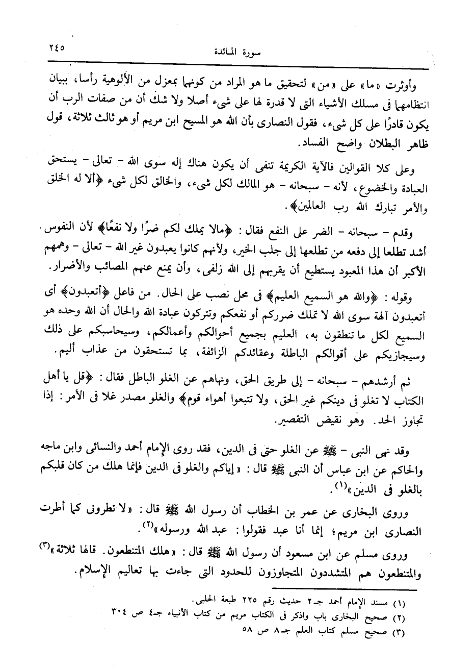 ثم أرشدهم- سبحانه- إلى طريق الحق، ونهاهم عن الغلو الباطل فقال: قُلْ يا أَهْلَ الْكِتابِ لا تَغْلُوا فِي دِينِكُمْ غَيْرَ الْحَقِّ، وَلا تَتَّبِعُوا أَهْواءَ قَوْمٍ والغلو مصدر غلا في الأمر: إذا تجاوز الحد. وهو نقيض التقصير.