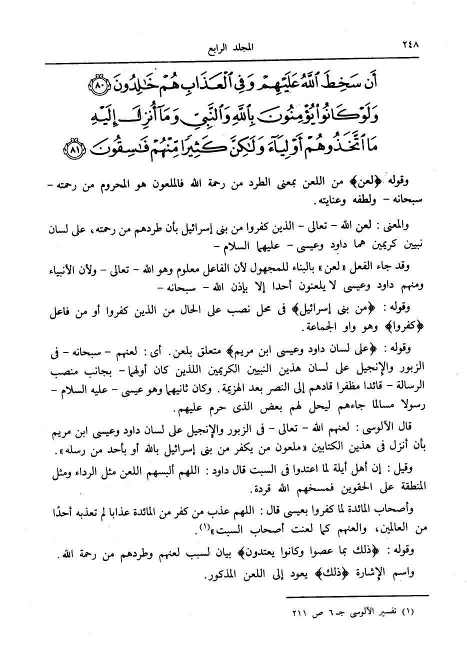 قال الآلوسى: لعنهم الله- تعالى- في الزبور والإنجيل على لسان داود وعيسى ابن مريم بأن أنزل في هذين الكتابين «ملعون من يكفر من بنى إسرائيل بالله أو بأحد من رسله» .