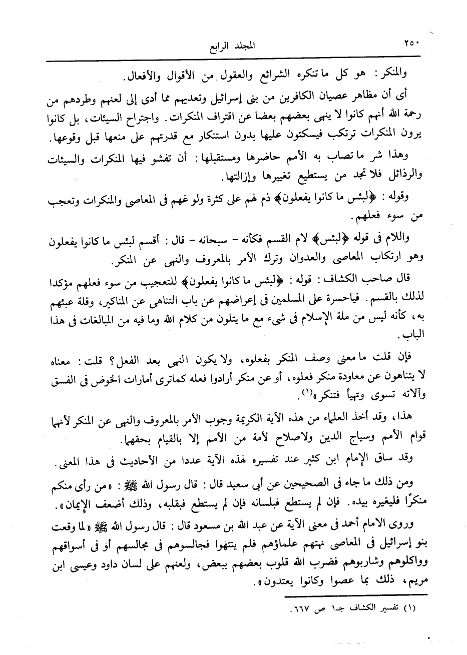 قال صاحب الكشاف: قوله: لَبِئْسَ ما كانُوا يَفْعَلُونَ للتعجيب من سوء فعلهم مؤكدا لذلك بالقسم. فيا حسرة على المسلمين في إعراضهم عن باب التناهى عن المناكير، وقلة عبئهم به، كأنه ليس من ملة الإسلام في شيء مع ما يتلون من كلام الله وما فيه من المبالغات في هذا الباب.