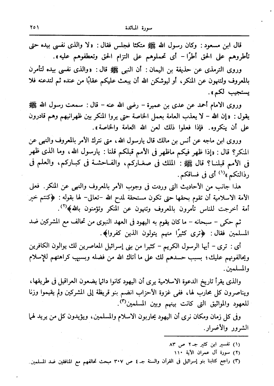 هذا جانب من الأحاديث التي وردت في وجوب الأمر بالمعروف والنهى عن المنكر. فعلى الأمة الاسلامية أن تقوم بحقها حتى تكون مستحقة لمدح الله- تعالى- لها بقوله: كُنْتُمْ خَيْرَ أُمَّةٍ أُخْرِجَتْ لِلنَّاسِ تَأْمُرُونَ بِالْمَعْرُوفِ وَتَنْهَوْنَ عَنِ الْمُنْكَرِ وَتُؤْمِنُونَ بِاللَّهِ «2» .