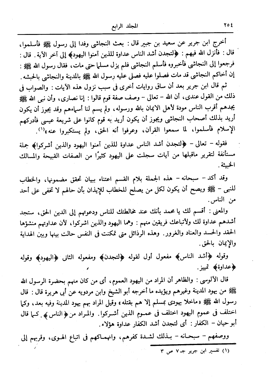 أخرج ابن جرير عن سعيد بن جبير قال: بعث النجاشيّ وفدا إلى رسول صلى الله عليه وسلم فأسلموا، قال: فأنزل الله فيهم: لَتَجِدَنَّ أَشَدَّ النَّاسِ عَداوَةً لِلَّذِينَ آمَنُوا الْيَهُودَ إلى آخر الآية. قال:
